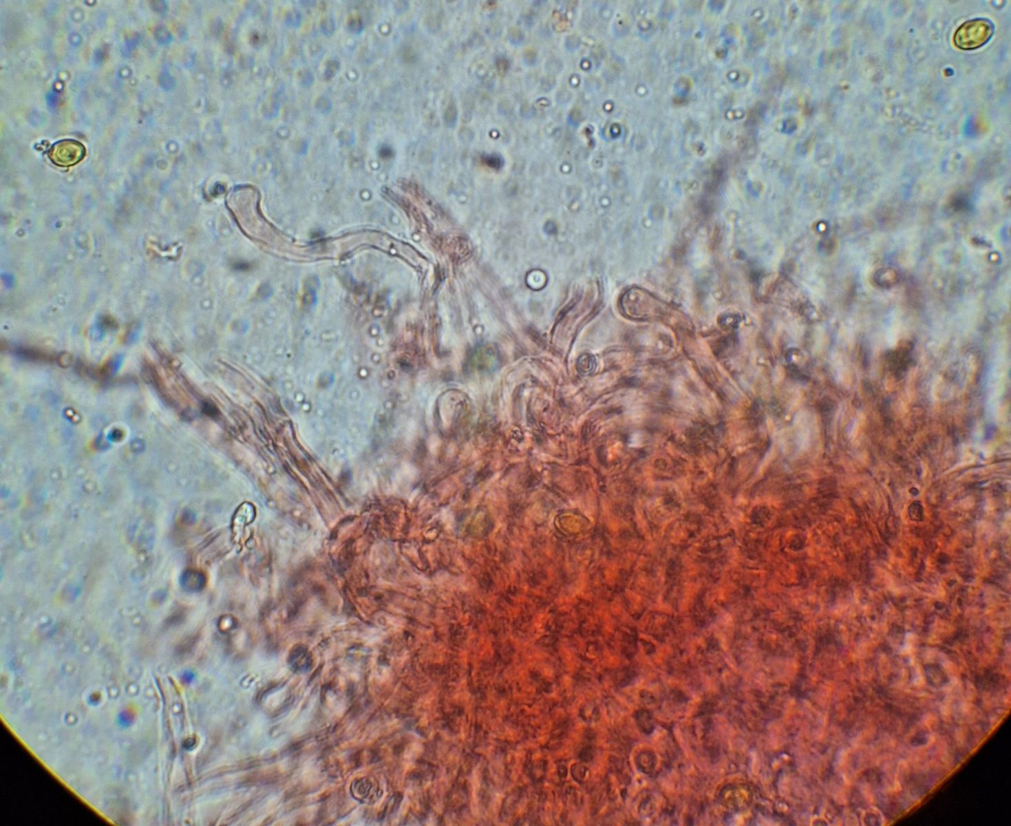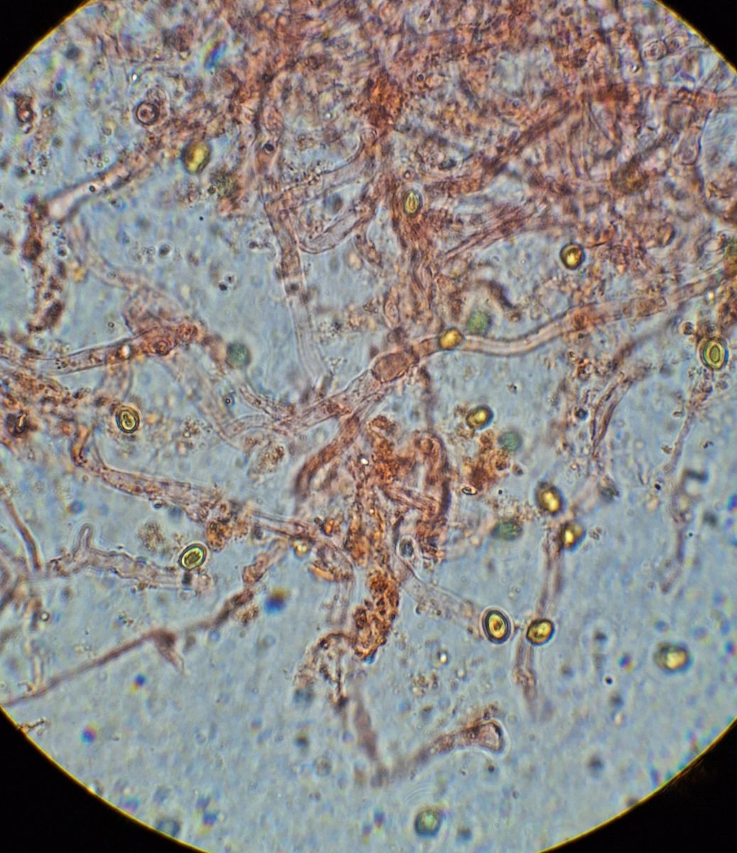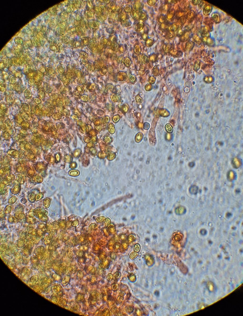 Aufgrund Deiner Prognose mit der Färbung in Jod habe ich von einem getrockneten Stück noch mal die Sporen angeschaut, viel Sporen waren da nicht mehr da
