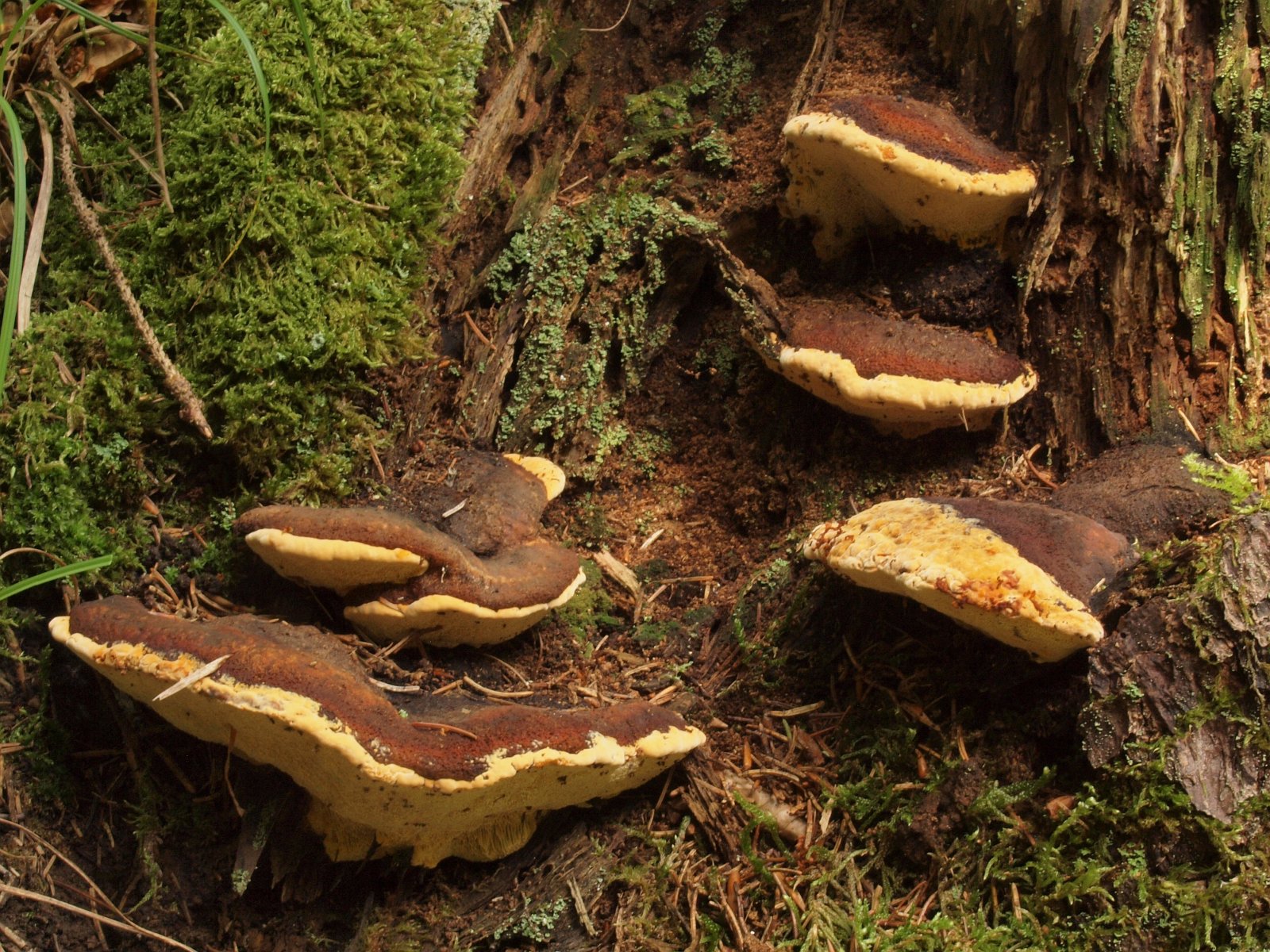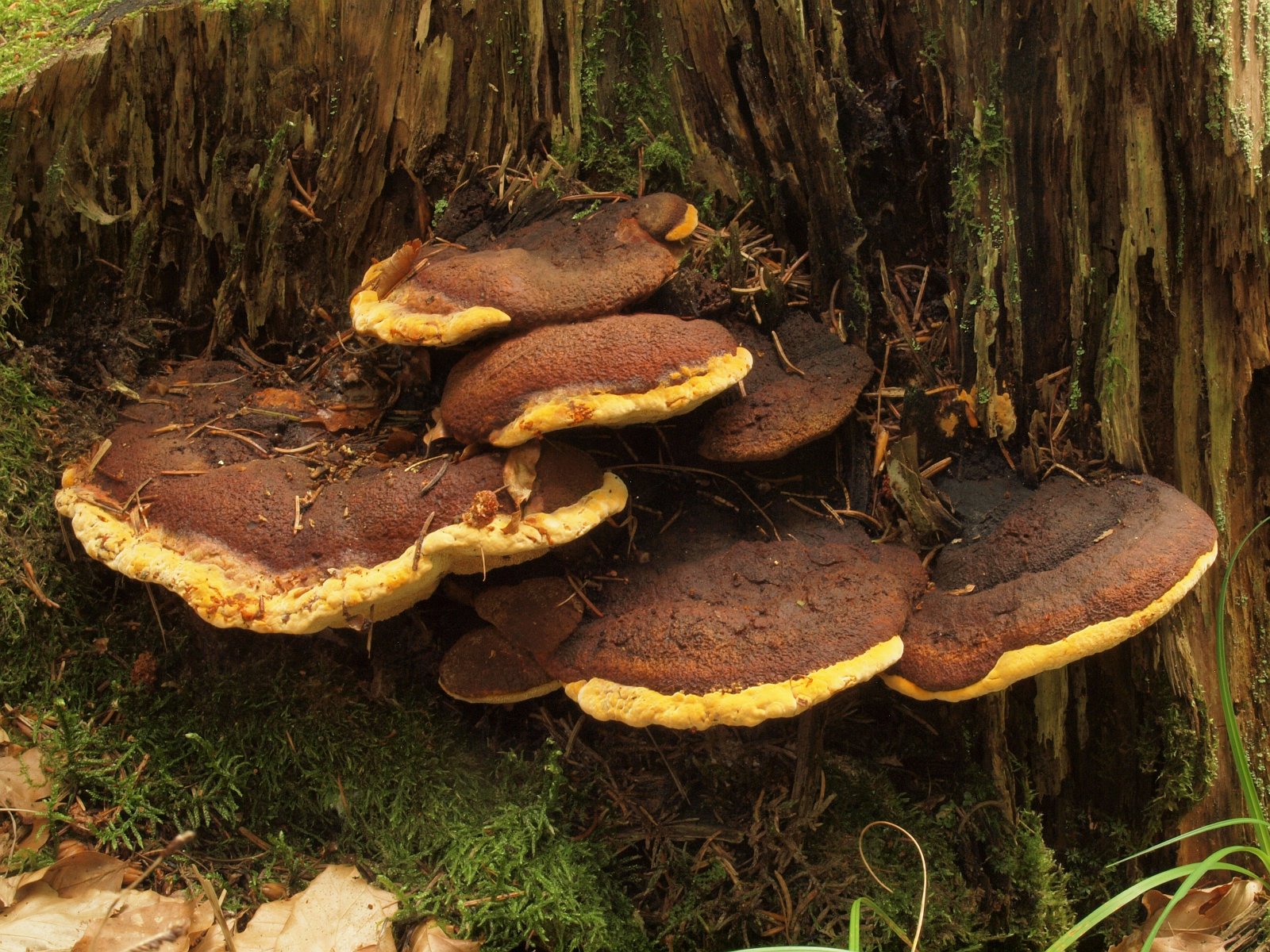 Gloeophyllum odoratum (Fenchelporling) wuch an zwei Seiten am gleichen Fichtenstumpf