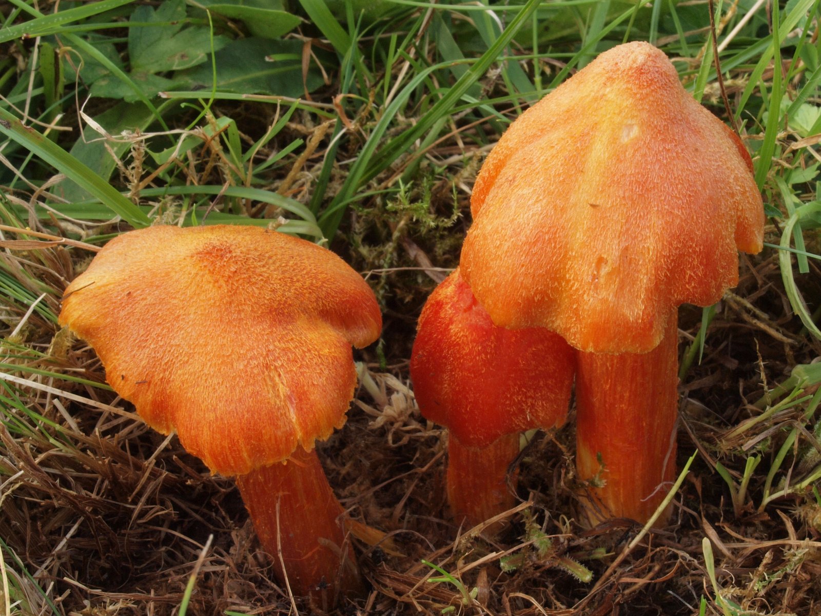 Hygrocybe calciphila (Kalkholder Filz-Saftling) ähnliche Arten wie H. miniata und H. helobia sind eher auf sauren Böden zu finden
