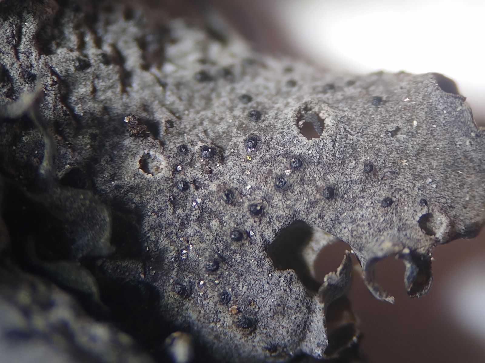Die graue Oberseite zeigt Löcher und schwarze, tief eingesenkte Perithecien (oder hier wohl Pseudothecien):