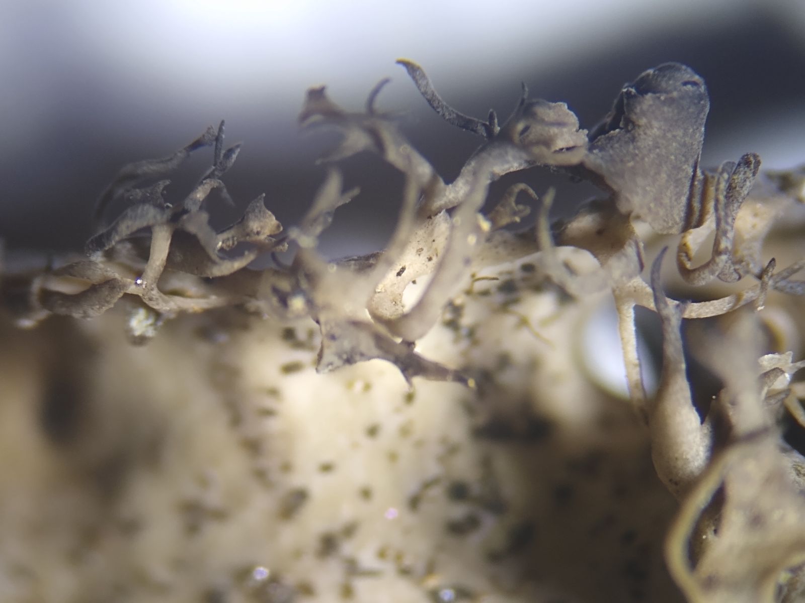 Bild 4 Gelbliche, rhizinienfreie Unterseite, verzweigende Zilien am Thallusrand