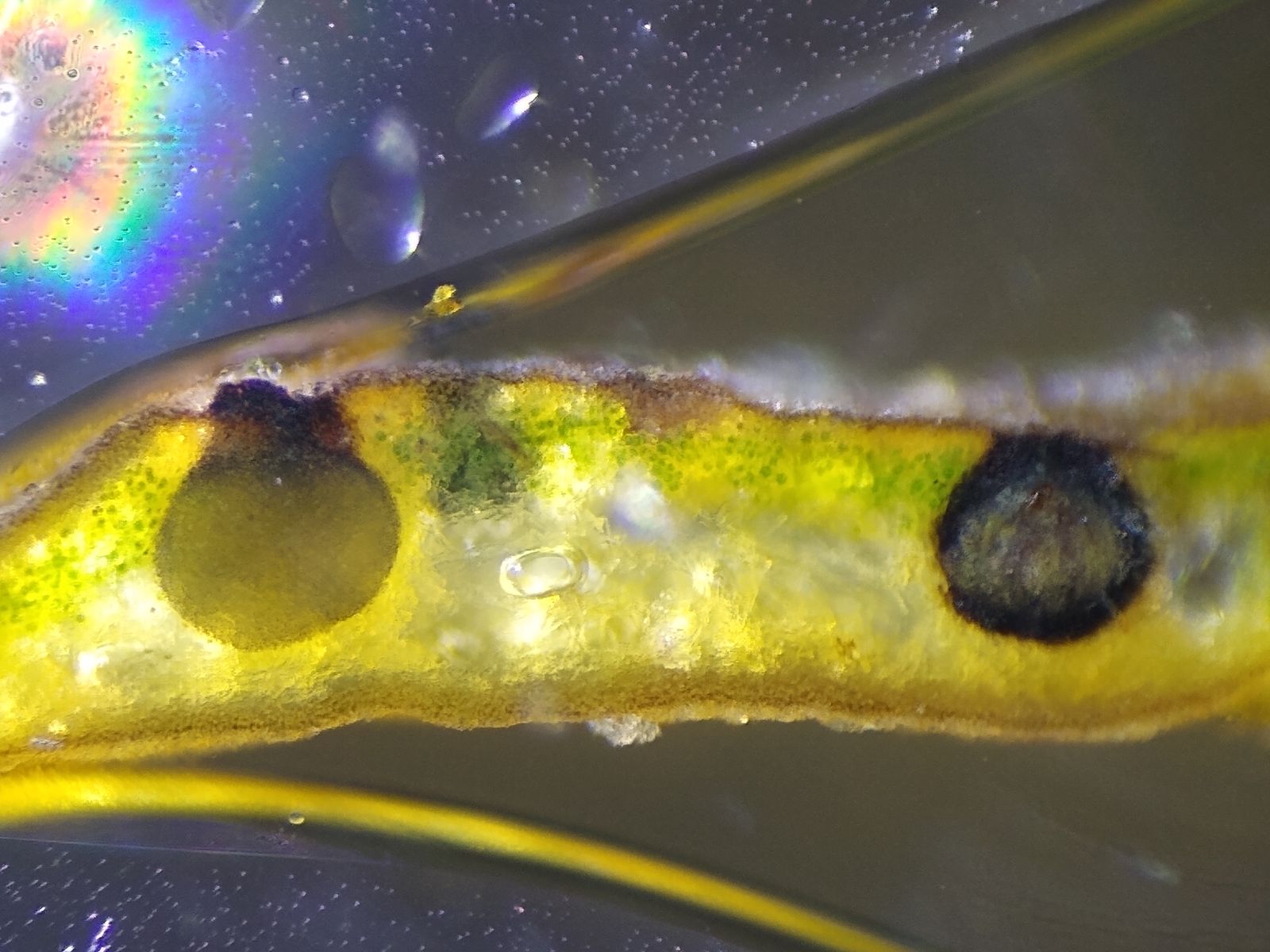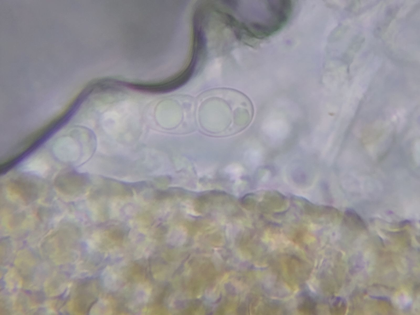 Bild 7 Sporen mit bis zu 3 Guttulen, im Alter braun gefärbt (mehrere kollabierte Sporen rechts im Bild)