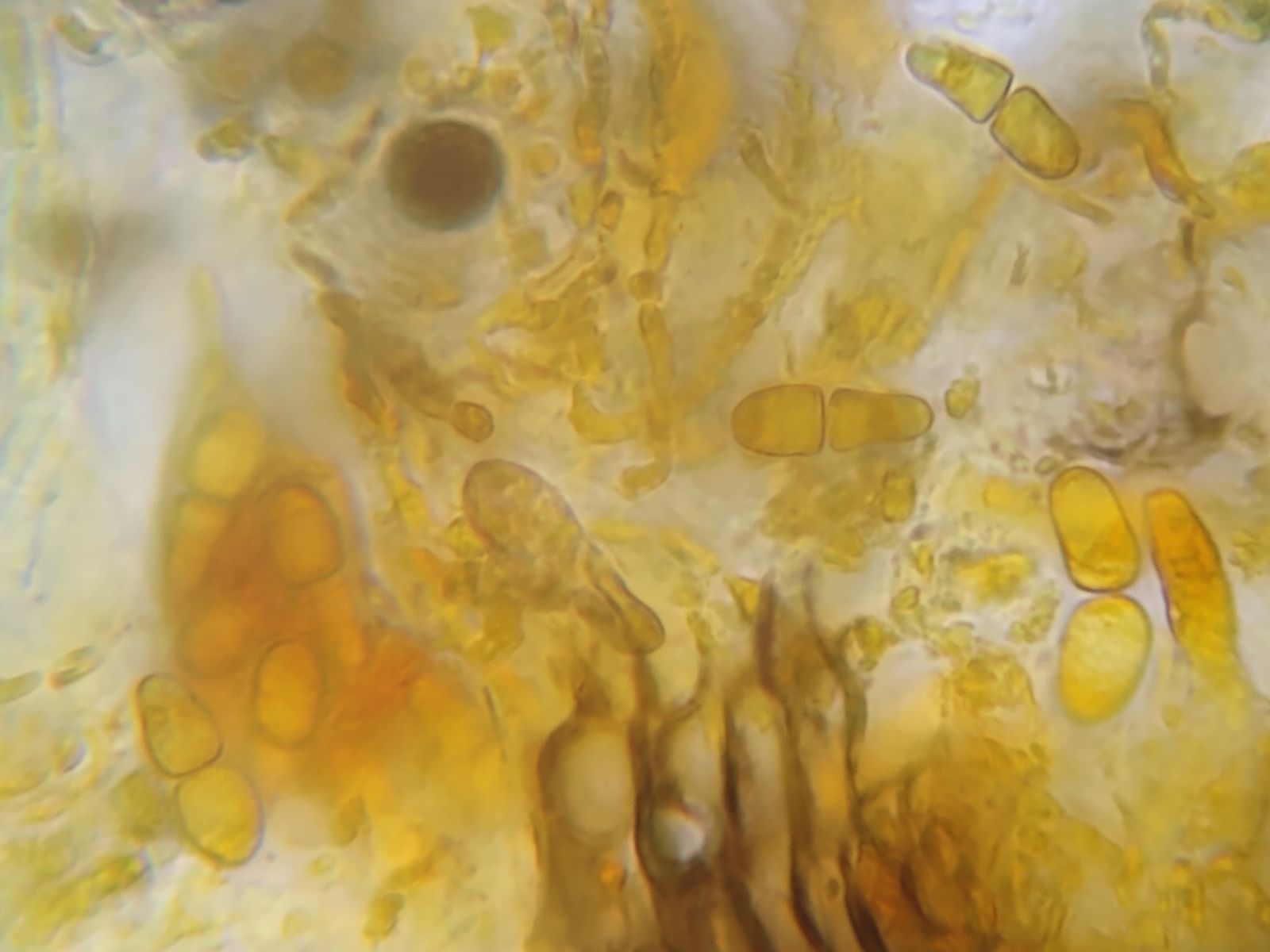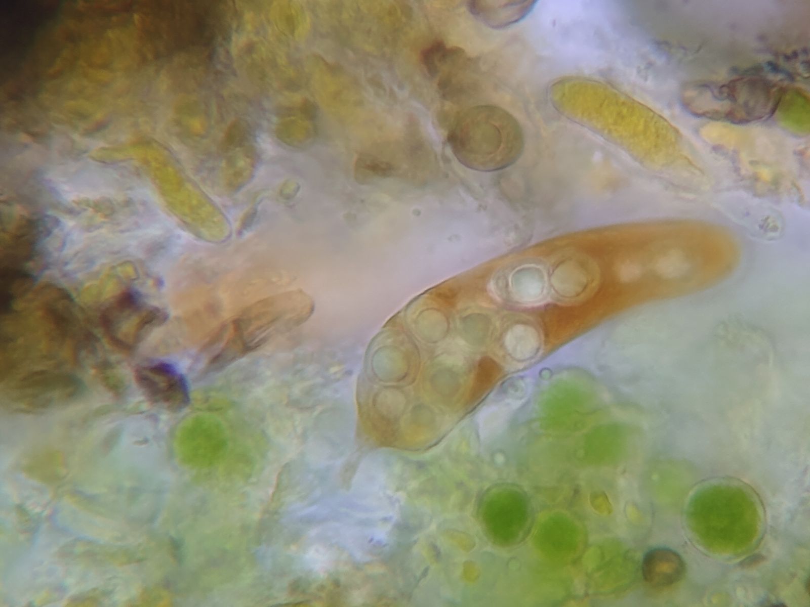 Bild 10 Gequetsches Hymenium mit freien, unreifen Sporen, Ascus und Hyphen (Periphysen?). Plasma in Lugol gelborange bis orangerot eingefärbt