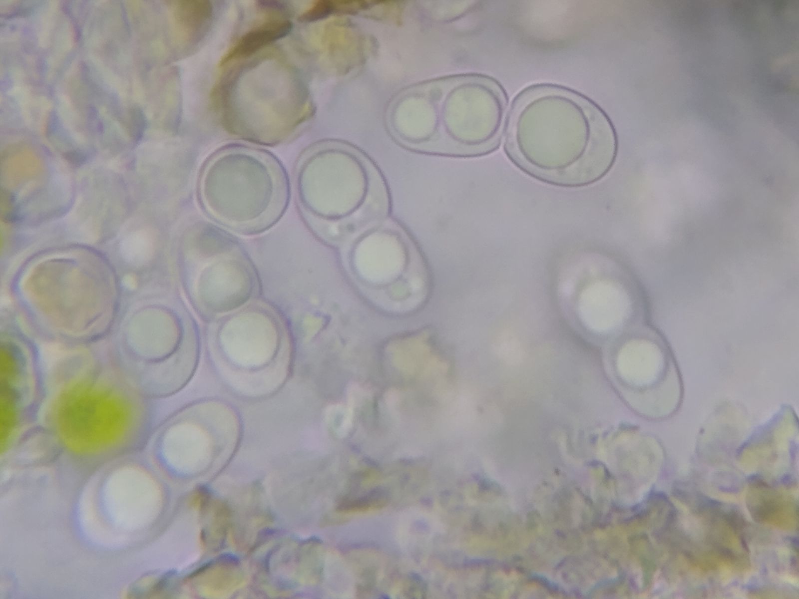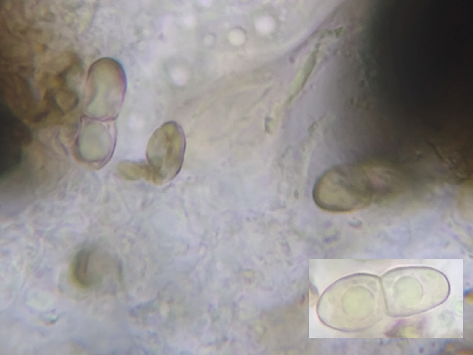 Bild 8 Junge, farblose Sporen (14,0) 18,0 - 20,0 x 7,5 - 8,5 µm groß. 2-3 Guttulen