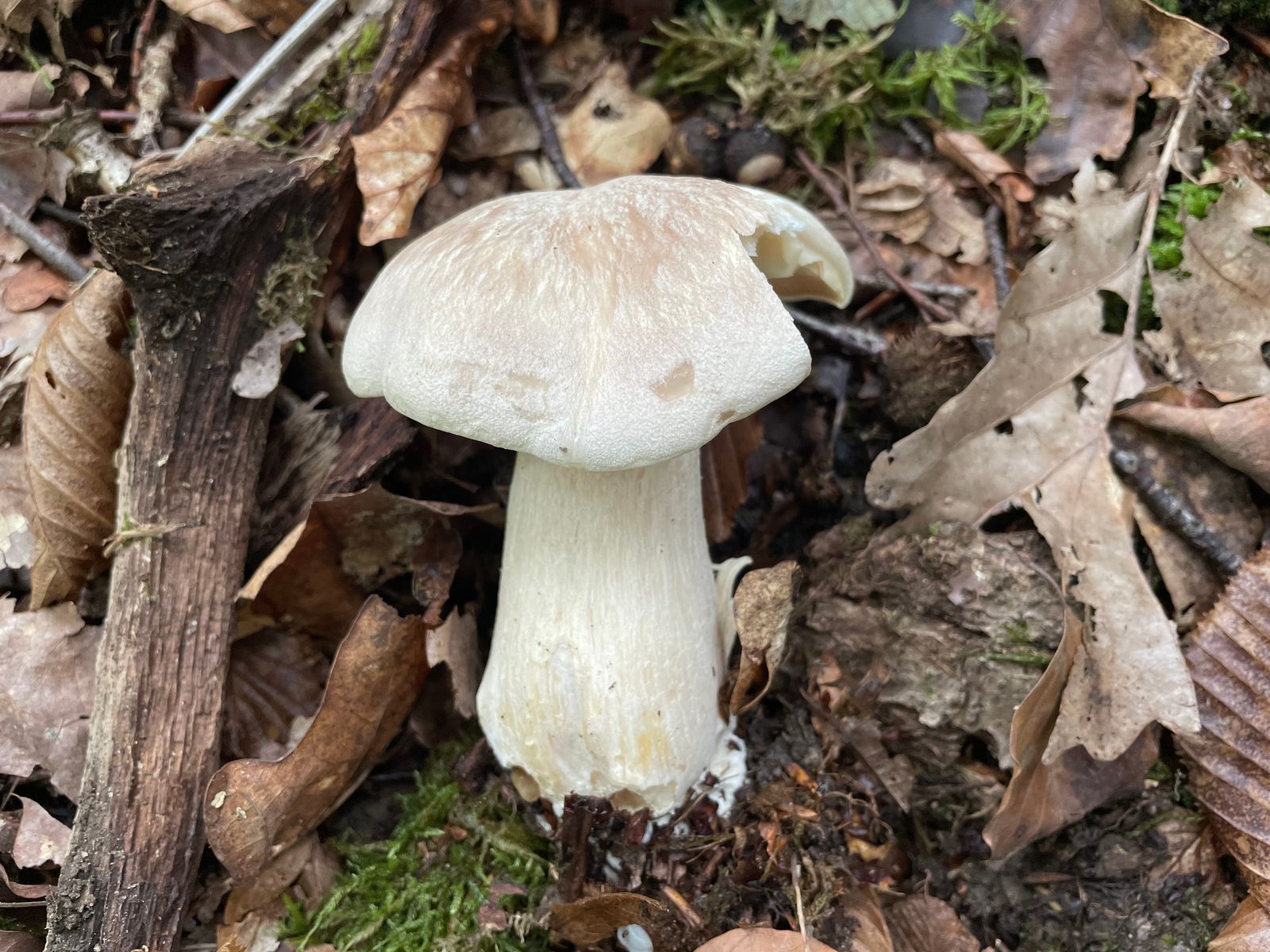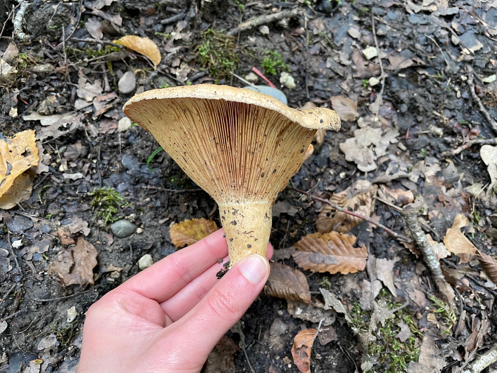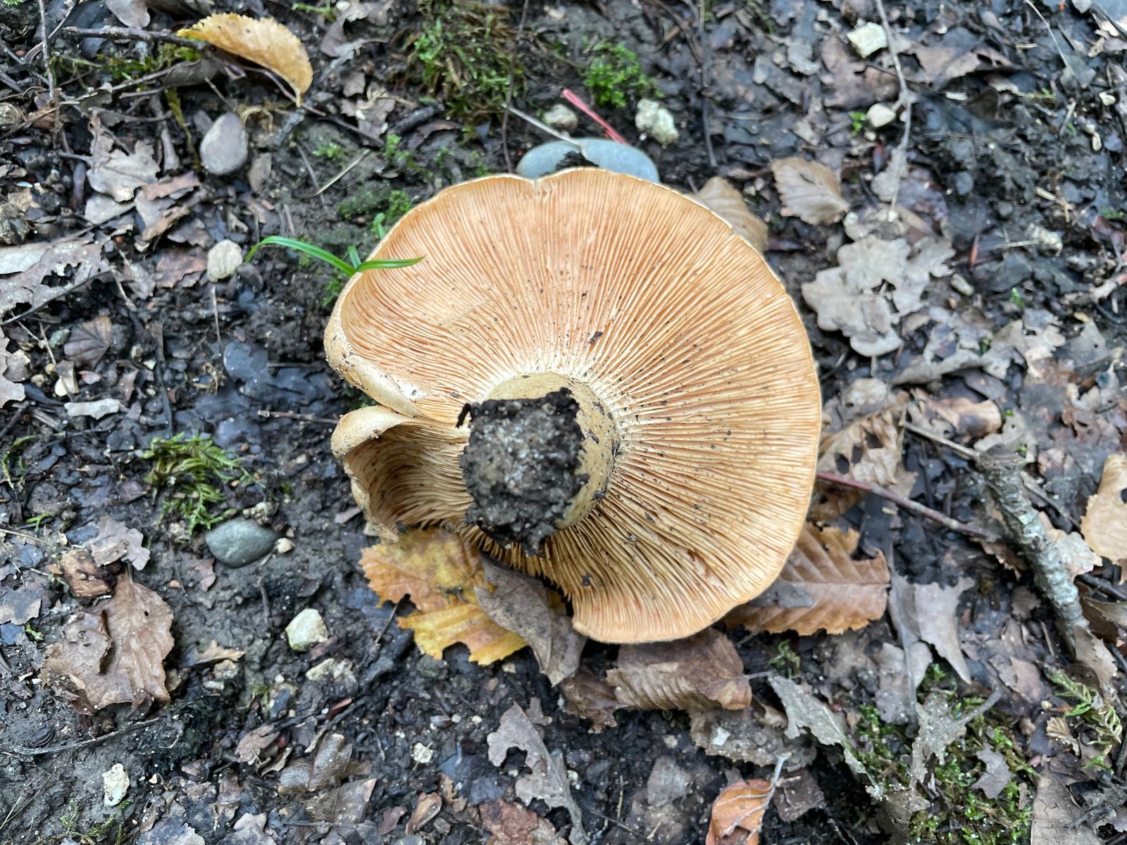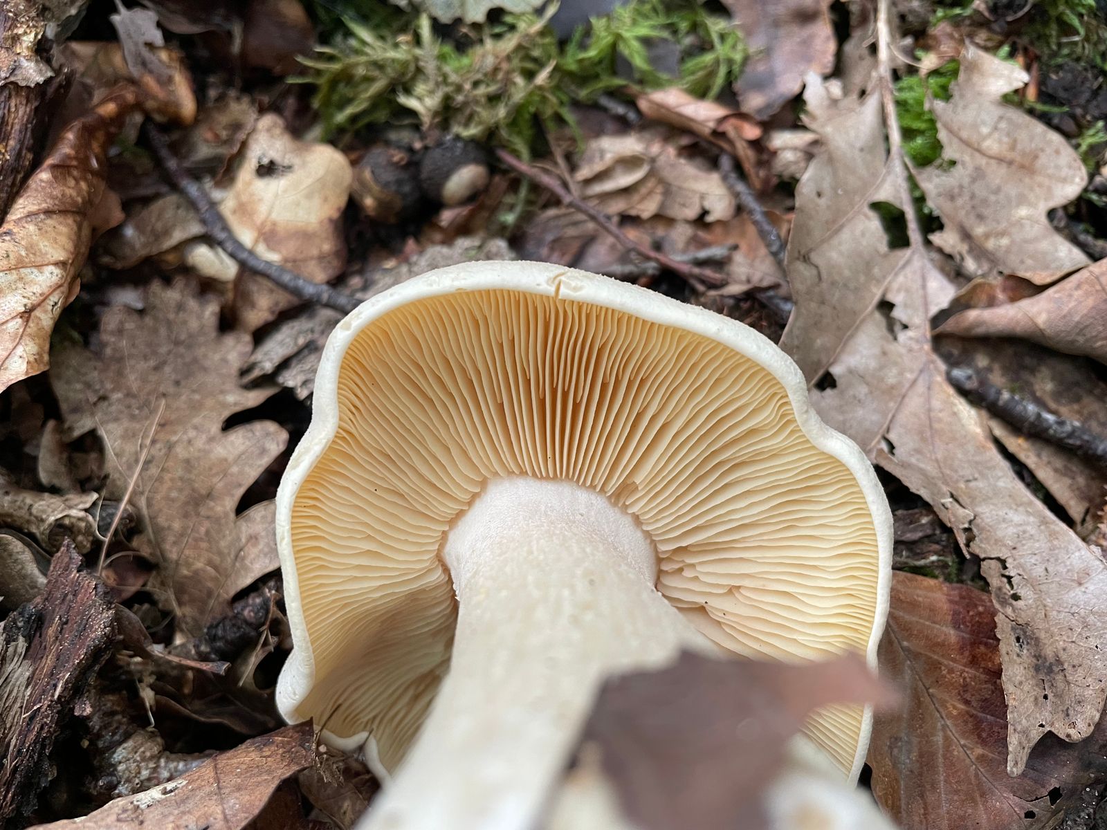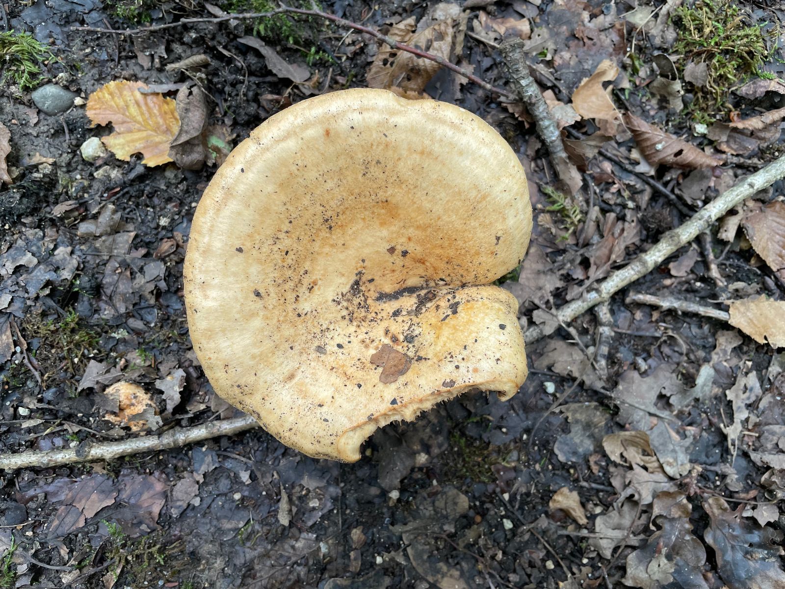 Direkt neben an, einmal über den Forstweg, standen zuletzt unzählige Glattstielige Hexenröhrlinge rum. Die Art hat sich nun verabschiedet, jedoch einen Nachfolger gefunden. Auch dieser ist zahlreich vertreten. Es dürfte sich hier um den Eichenmilchling handeln. Ob er es wirklich ist, hätte der Geruch bestätigen können. Leider war es derart eisig kalt, dass ich nicht wirklich was gerochen habe. Erstfund ist es glaube ich nicht, aber bewusst wahrgenommen habe ich die Art bisher nicht und auch nie danach gesucht. Hier war es das Massenwachstum, das mich aufmerksam gemacht hat. Der ganze Waldboden und sogar Teile vom Weg waren damit zugepflastert.