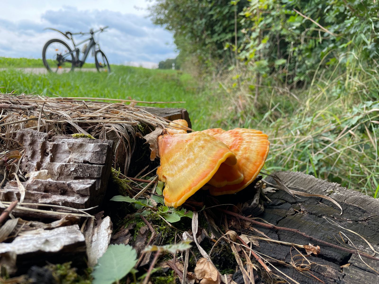 Auf dem Weg nach Hause gab es dann noch einen unerwarteten Fund am Straßenrand. Ein frischer Schwefelporling an einem Baumstumpf. Natürlich in Straßennähe nichts zum Verzehr, aber doch ein schicker Farbtupfer bei dem grauen Wetter.