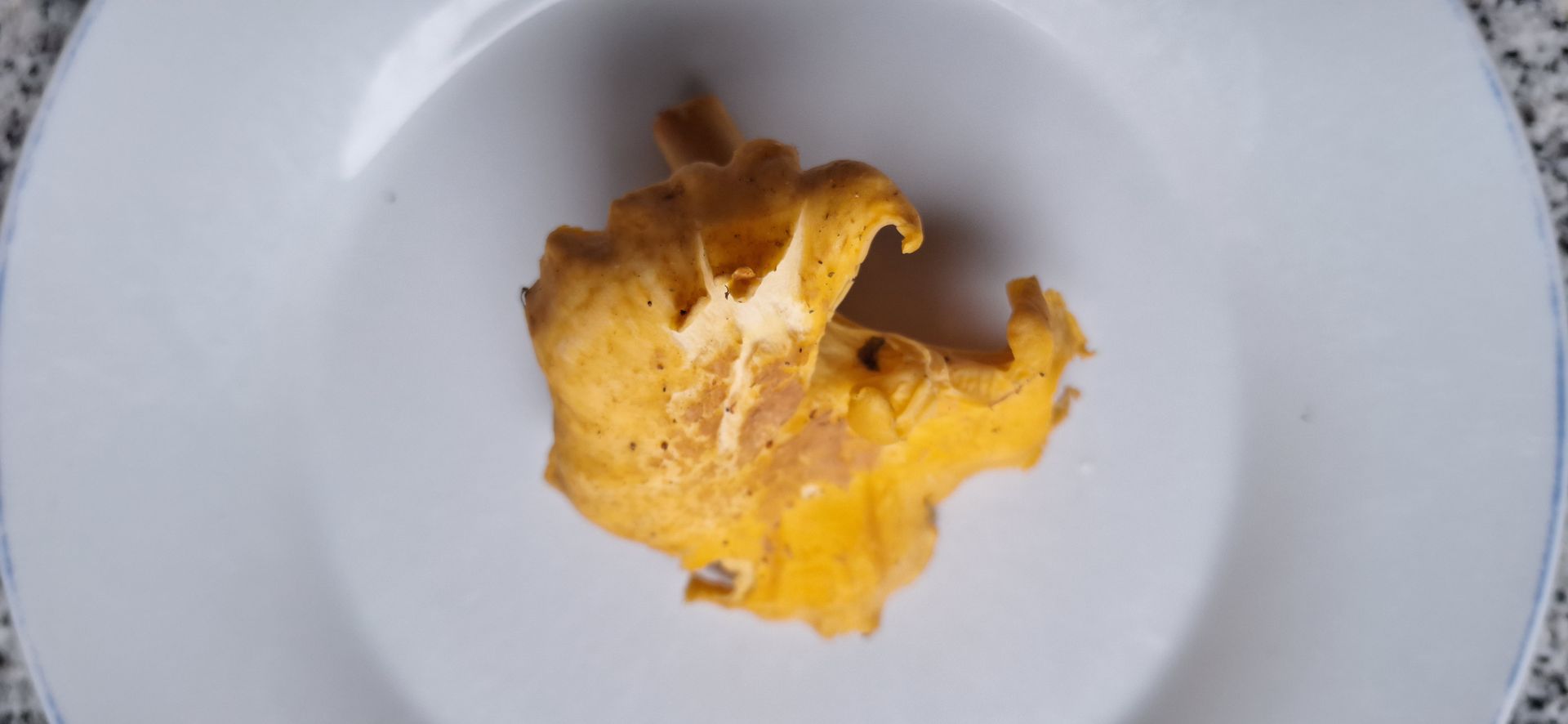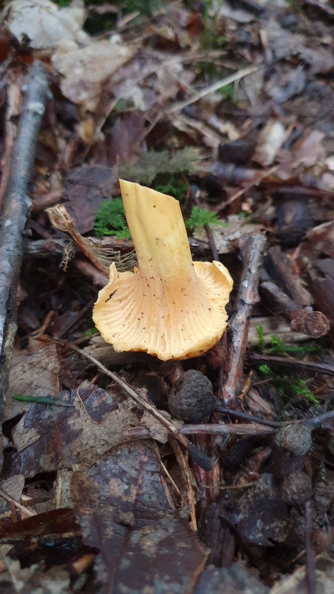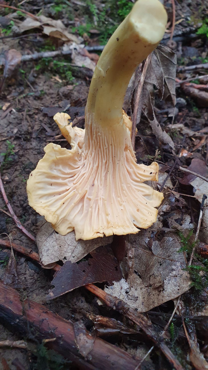 Eigentlich finde ich bei mir in der Gegend keine Pfifferlinge, umso mehr freute ich mich als ich heute überraschend in einem mir noch unbekannten kleinen Mischwäldchen große Mengen an Pfifferlingen entdecken konnte. Habe jetzt leider nicht darauf geachtet welche Laubbäume es waren, Nadelbäume waren auf jeden Fall Fichten und Tannen. Da ich kaum Pfifferlinge sammle kenne ich mich mit den einzelenen Arten leider auch nicht gut aus, jedoch ist mir dann als ich aus dem Wald gekrochen bin aufgefallen, dass manche Fruchtkörper Leisten mit einem auffälligen rosa-lila Schimmer und die Hütte auffällige kleine braune dunkle Schüppchen hatten.