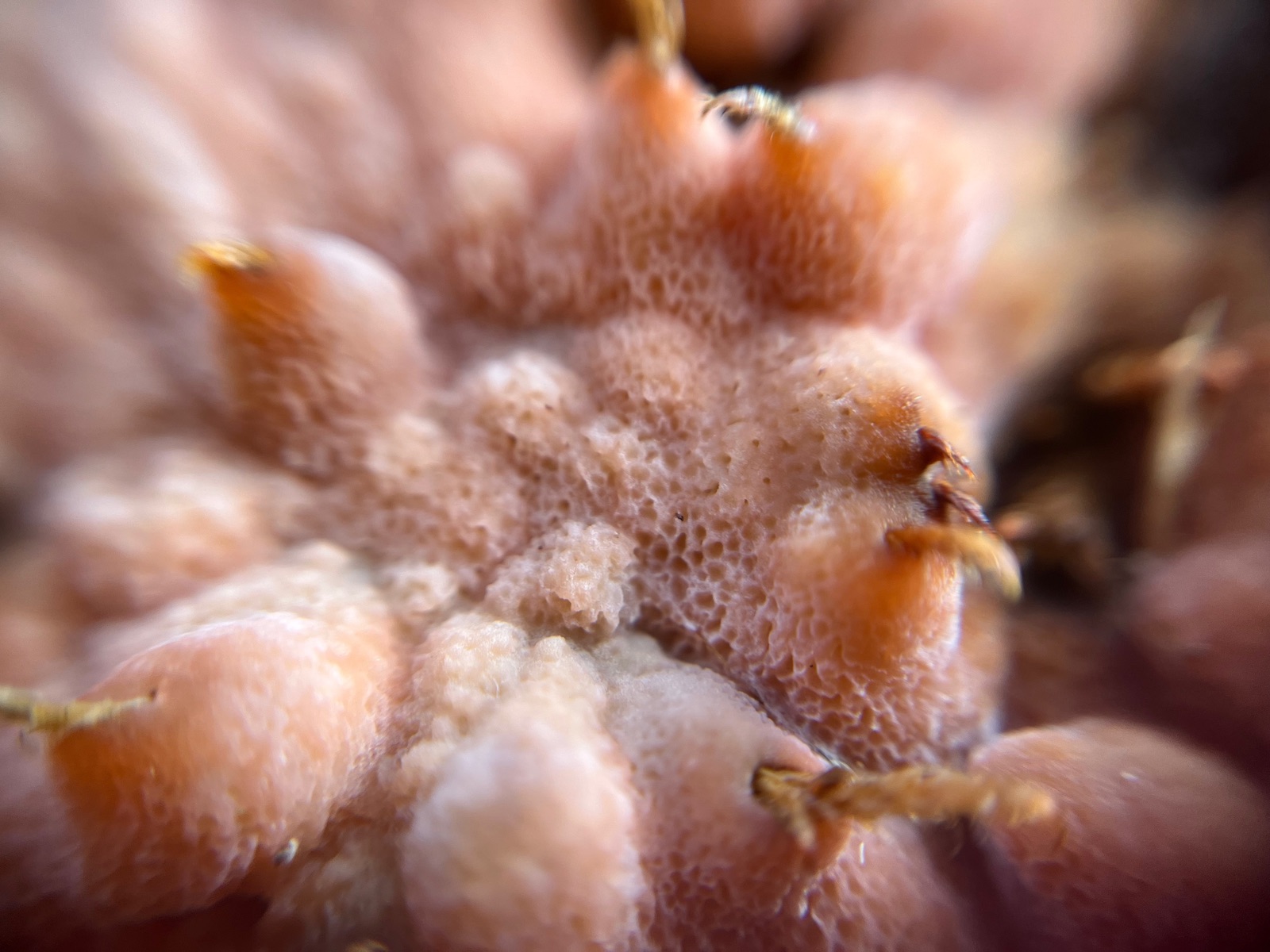 39. Abschließend noch ein Fund an einem Fichtenholz, der von Weitem nach Erbrochenem aussah. Ein Blick aus der Nähe lässt einen nicht ganz typisch gewachsenen Rosa Saftporling - Rhodonia placenta vermuten. Was denkt ihr?