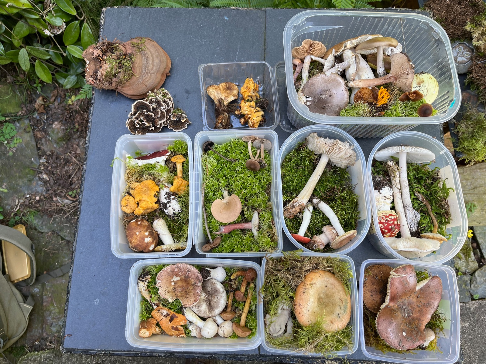 Nach insgesamt 11 Stunden Suchens war das Ergebnis von nur ca. 40 Arten für die Pilzausstellung an Tag 13 etwas ernüchternd. Hier eine Auswahl. Nur zwei Cortinarienarten, Immerhin ein paar Wulstlingsarten, über den Porphyrgrauen habe ich mich gefreut, der ist hier nicht sehr häufig.