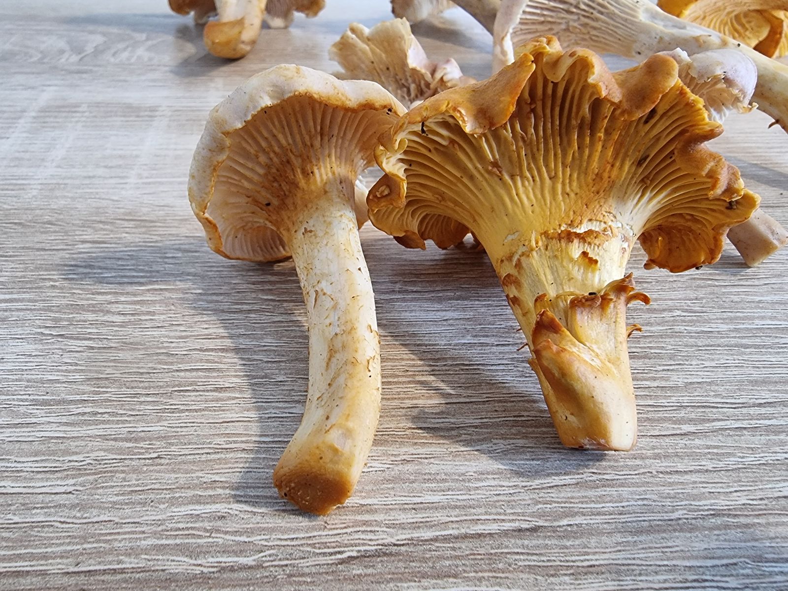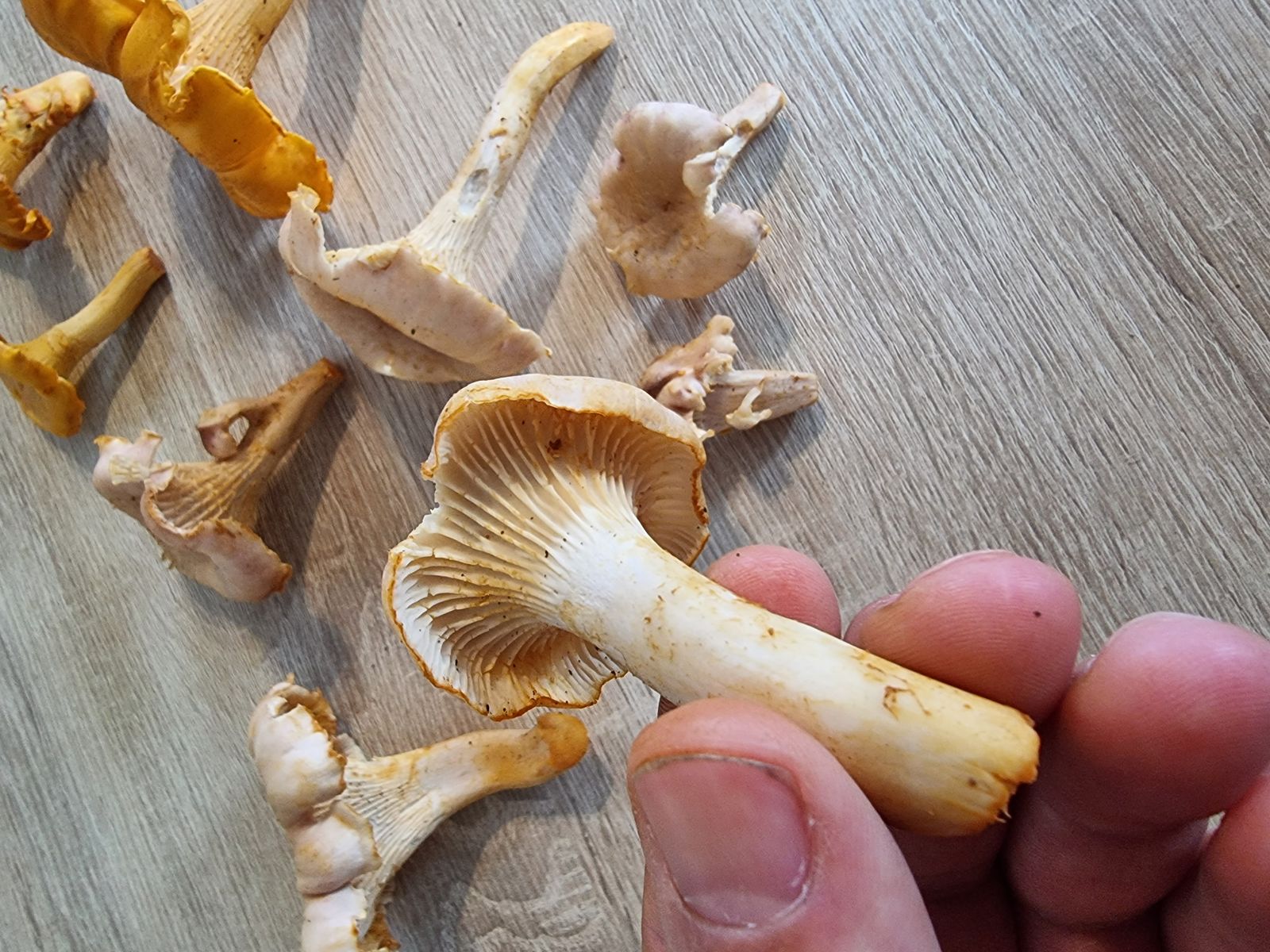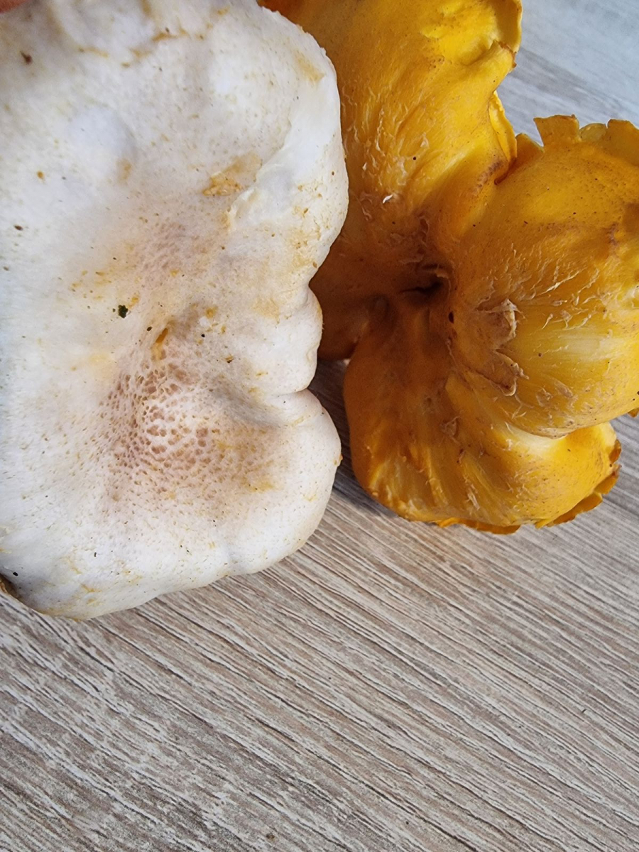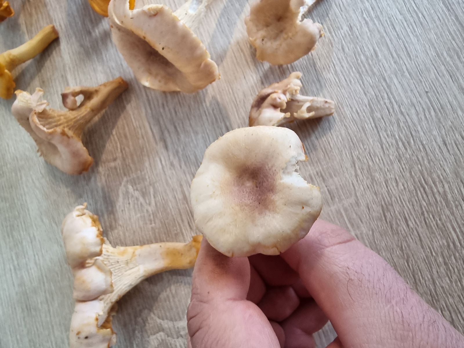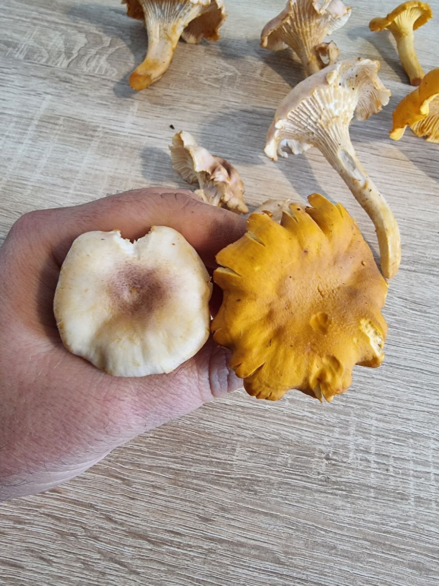 komme gerade aus dem Wald zurück, mit einem gut gefüllten Pilzkorb. Die Violettschuppigen Pfifferlinge wachsen hier gerade in Massen. Nun konnten wir an einer Stelle vermeintlich Blassse Pfifferlinge finden, rund 20 Fruchtkörper unterschiedlicher Altersstadien. Für uns wäre das ein Erstfund. Allerdings, obwohl viele Merkmale passen, die Fruchtkörper besitzen eindeutig violette Schuppen auf der Hutoberseite. Sind das vielleicht doch Violettschuppige Pfifferlinge die einfach sehr hell ausfallen?