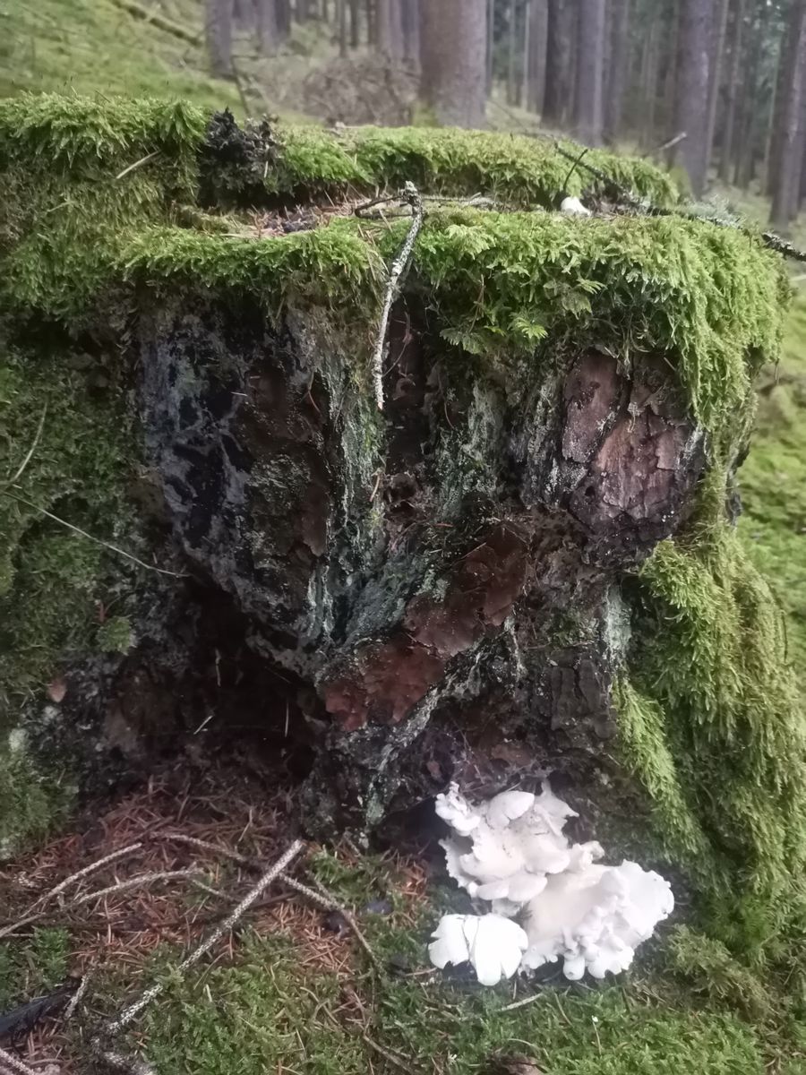 Also I sag jetzt definitiv Osteina obducta am lärchen Stumpf oder bin i dumm. Lg wisst ihr was der büschelige Pilz wäre.