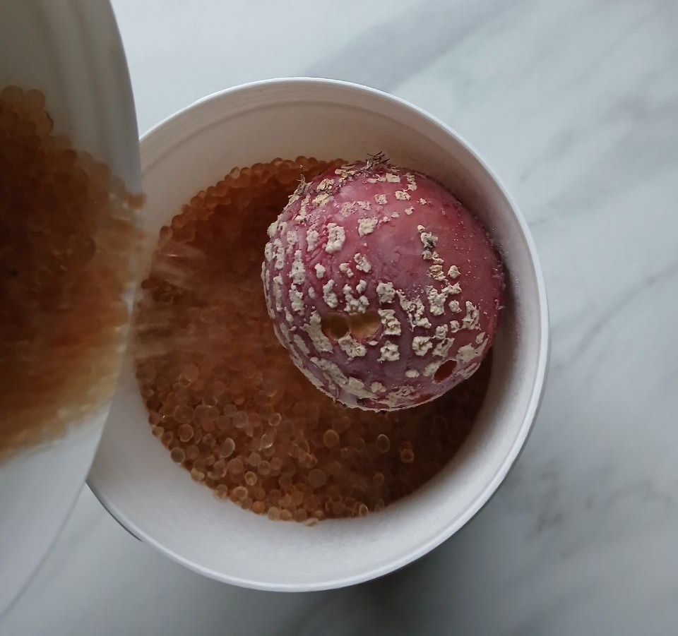 Hier wird der gefrorene Pilz mit dem wasserentziehenden gefrorenen Granulat vereinigt und wieder in die TK gestellt.