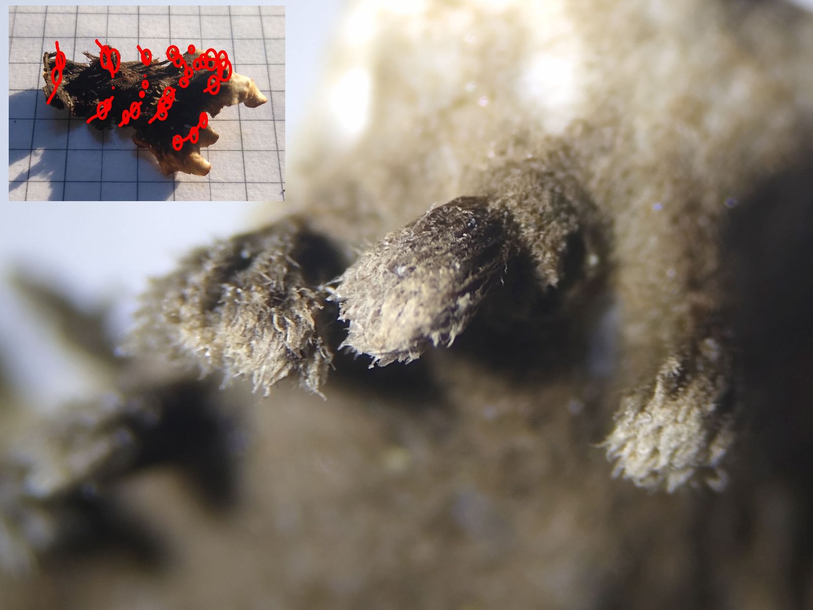Bild 2 Rhizinien in konzentrischen Ringen angeodnet. Im Bildeinsatz habe ich die Position der Rhizinien mit Ellipsen markiert und durch Kreisbögen verbunden.