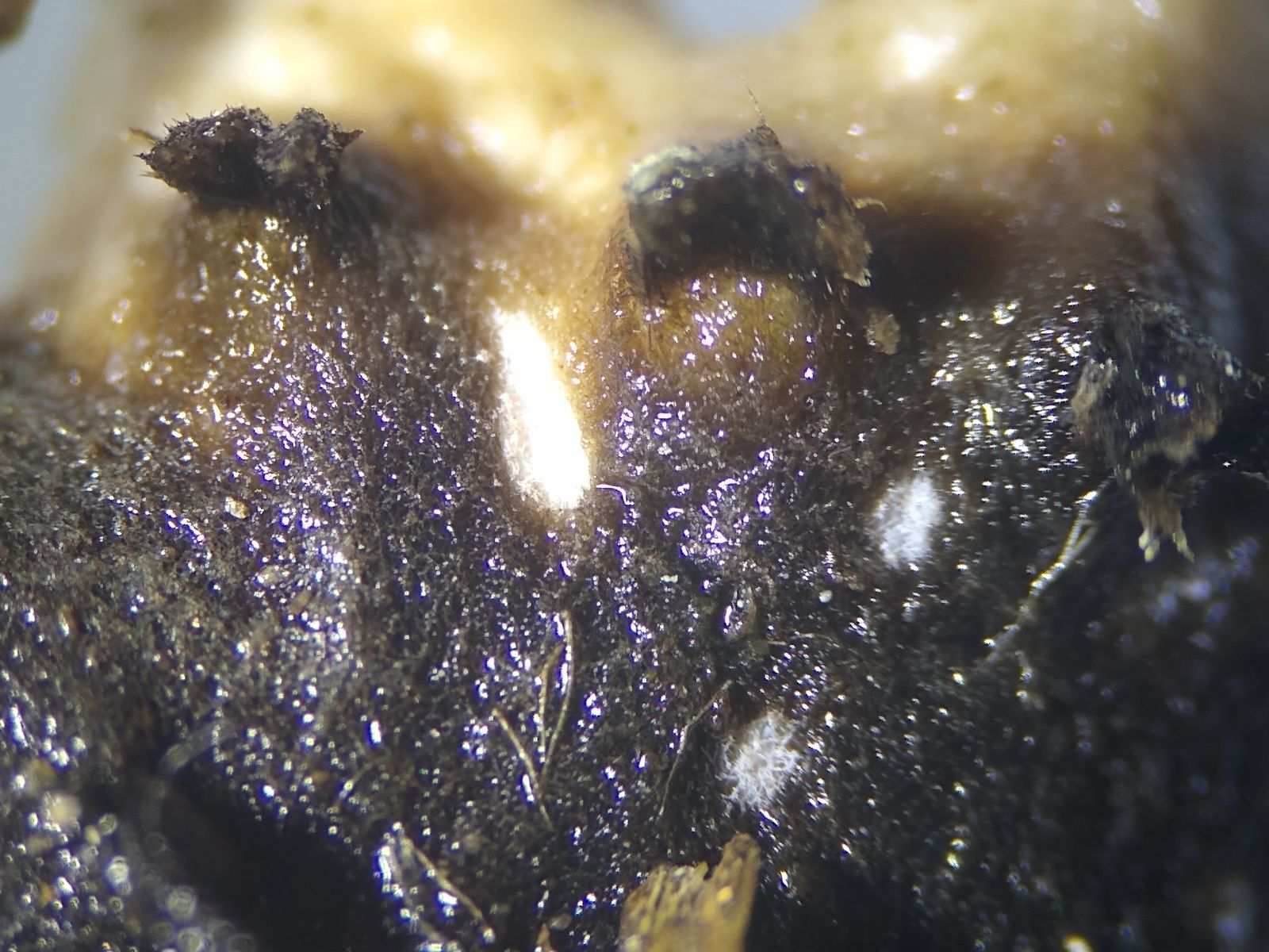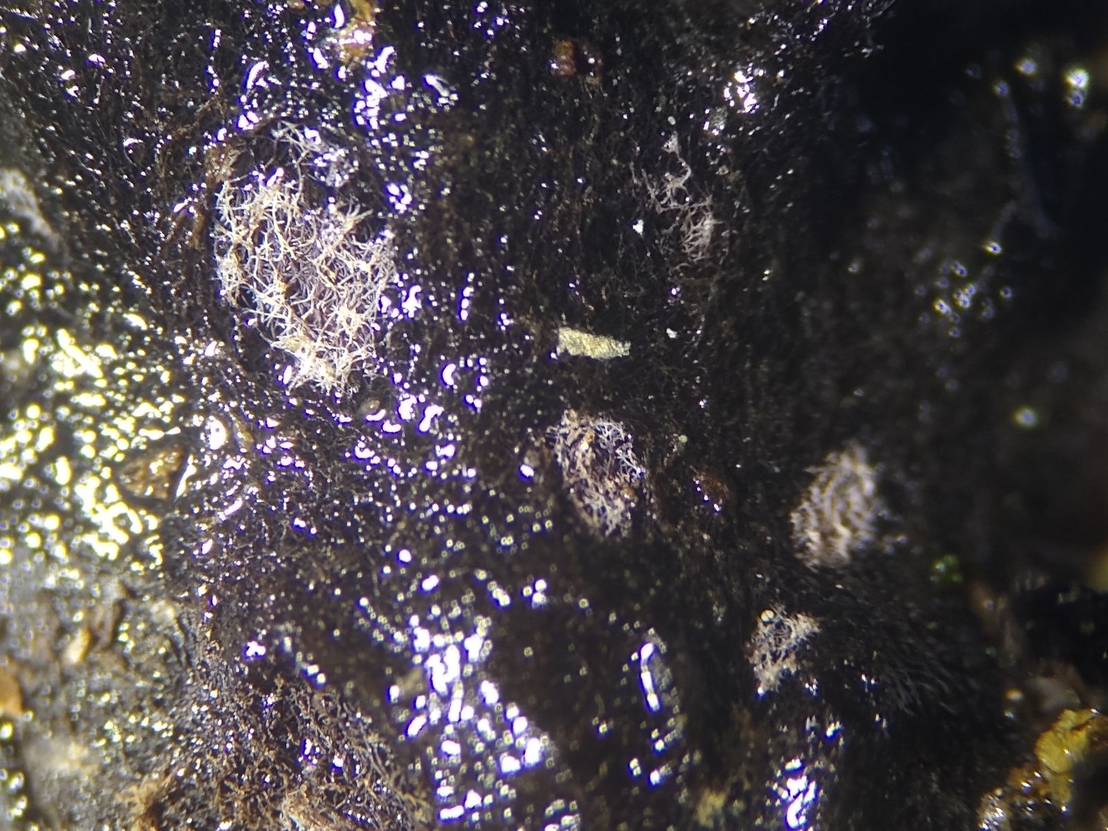Bild 3 Unterseite nass, schwarz filzig, mit weißen Fenstern. Ein Stück weiter innen weiß filzige Stellen.