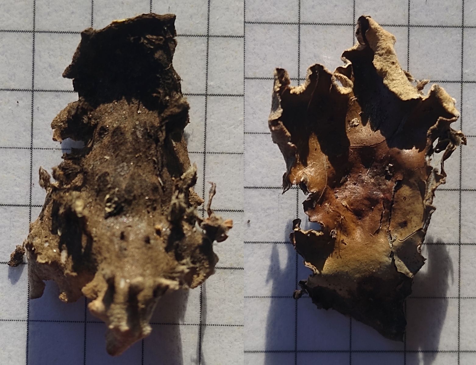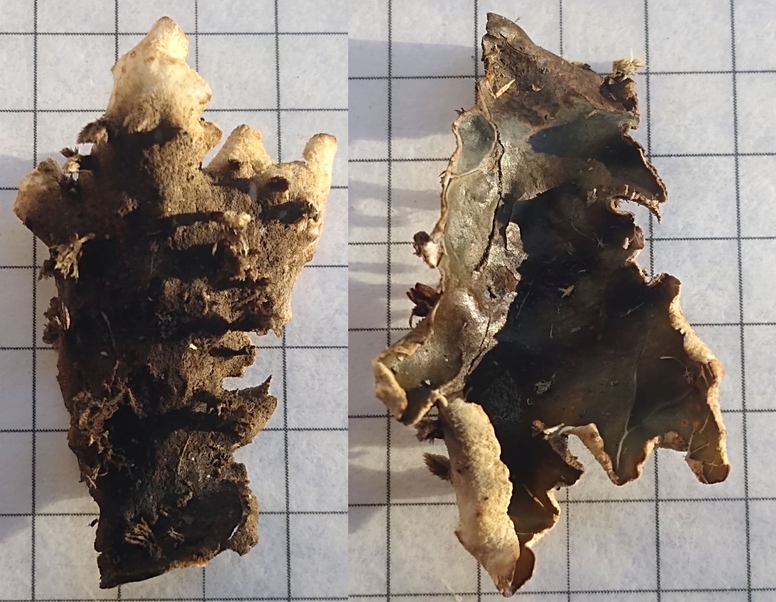 Bild 5 Unter- und Oberseite der angefeuchteten Flechte im Abendlicht auf weißem Untergrund (5mm-Raster)