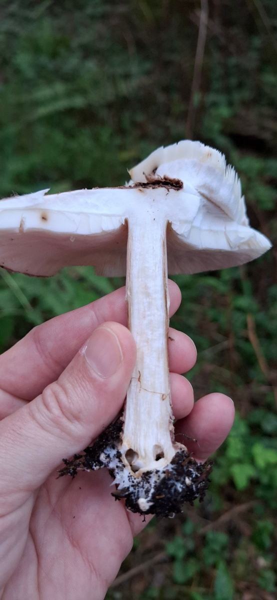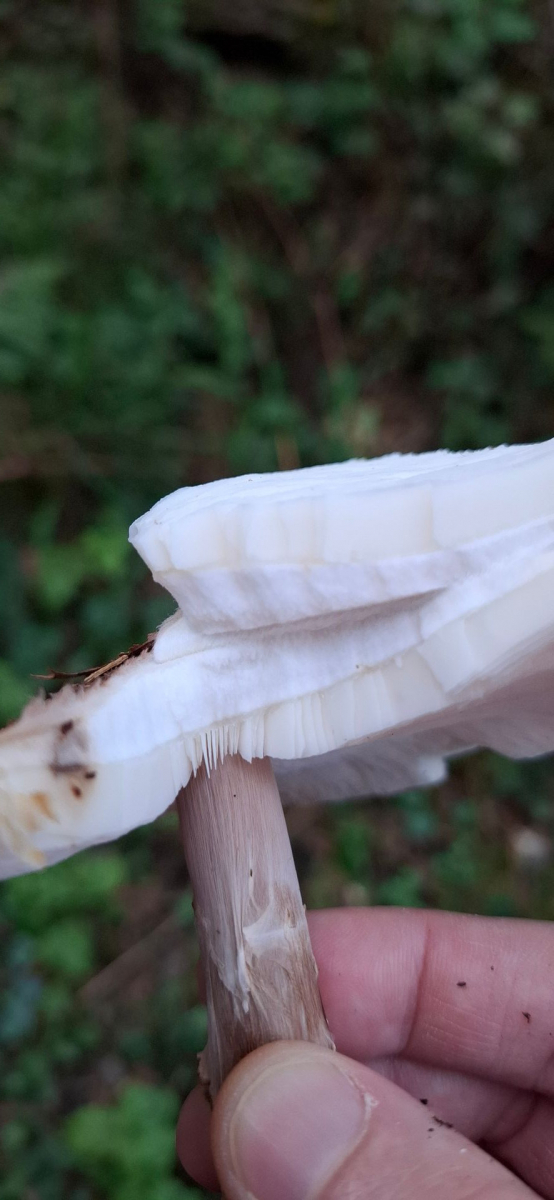 Hutfleisch schneeweiß. Keine Verfärbungen bei Verletzung. Durchmesser ca 12 cm (einige Stachelschirmlinge sollen max 8 cm werden, weshalb ich diese ausschließen würde.