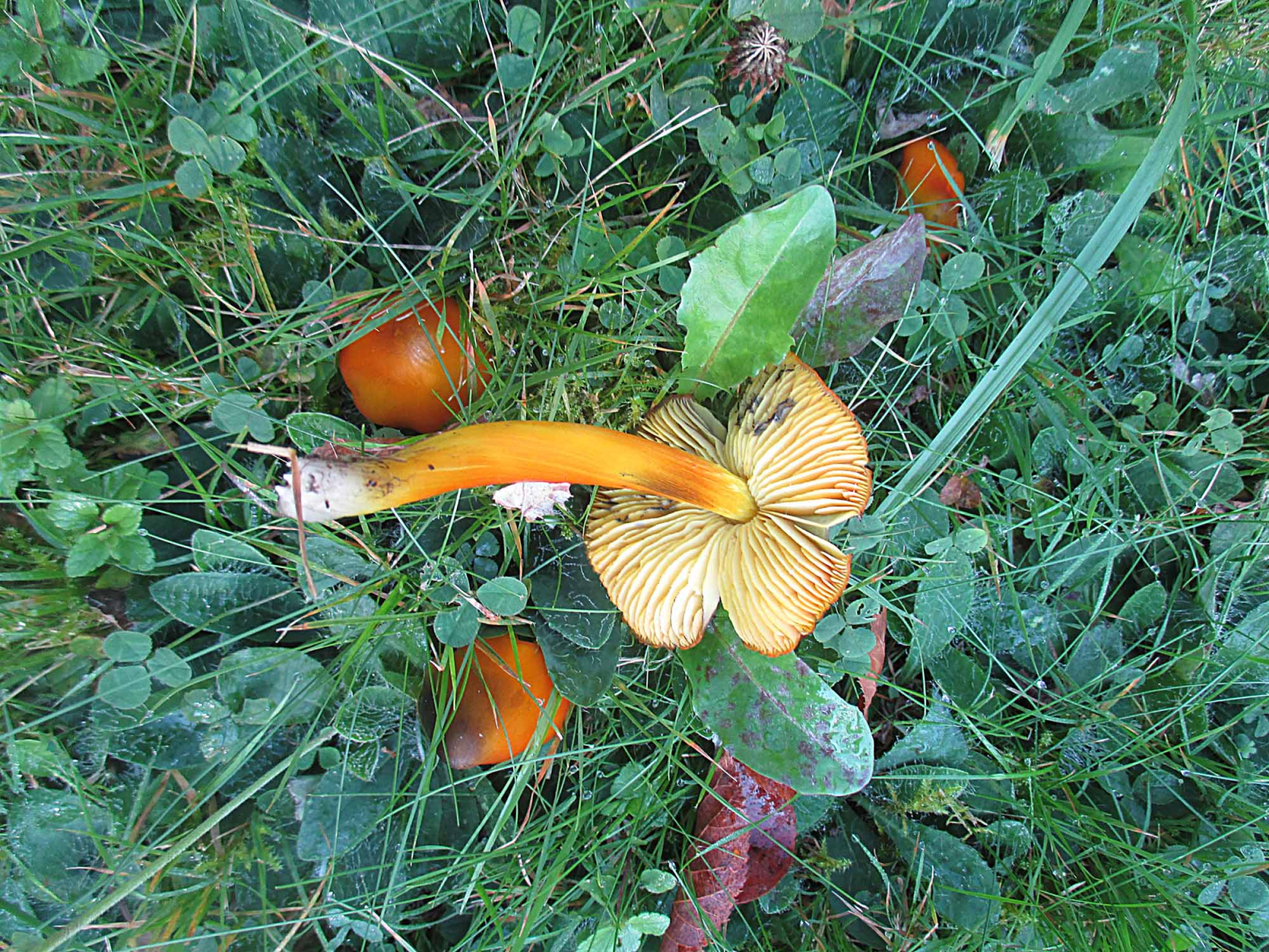Eine schöne Gruppe Kegeliger Saftlinge zeigte sich auf einer Wiese.