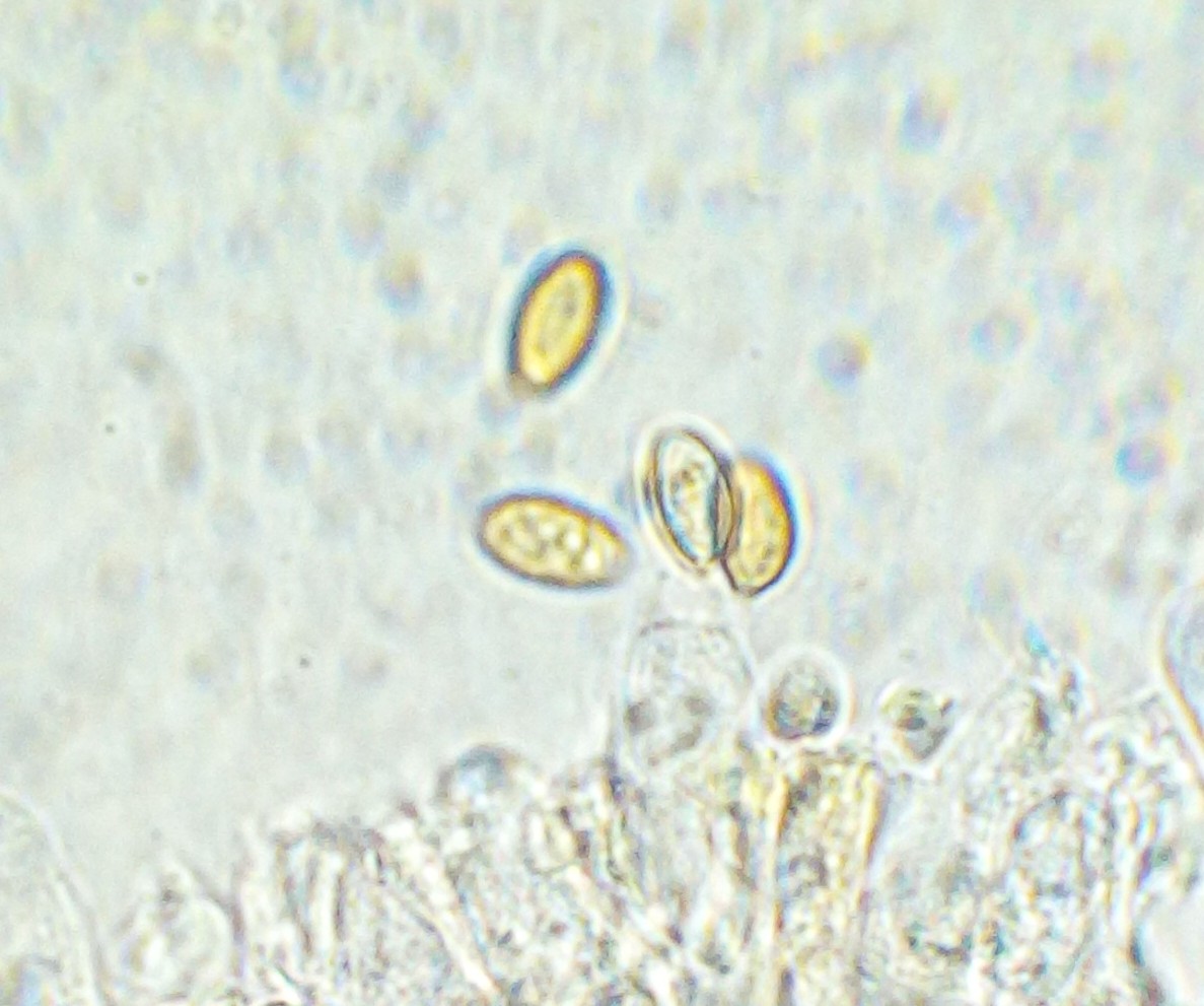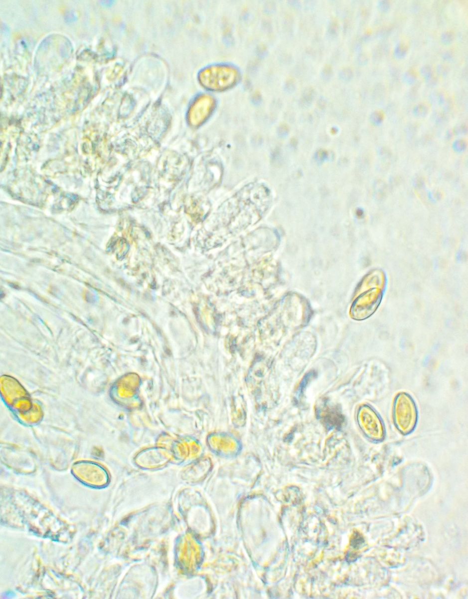 Bis 1,5 cm Hutdurchmesser, hygrophan. Die Lamellen würde ich als frei bezeichnen, oder zumindest nur sehr schwach angewachsen. Sporen leicht gelblich, unregelmäßig oval geformt, 7-8 * 4 µm.