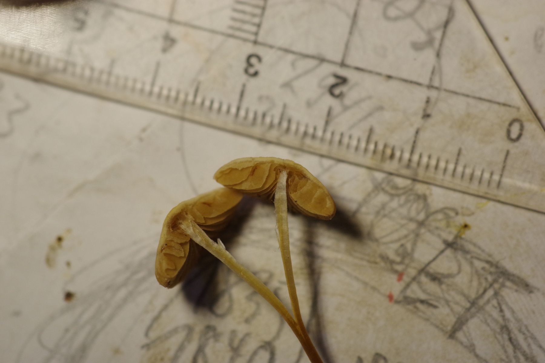 Bis 1,5 cm Hutdurchmesser, hygrophan. Die Lamellen würde ich als frei bezeichnen, oder zumindest nur sehr schwach angewachsen. Sporen leicht gelblich, unregelmäßig oval geformt, 7-8 * 4 µm.