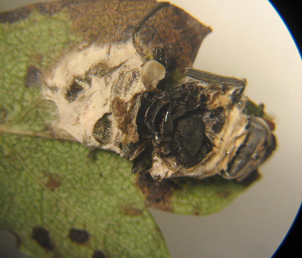 Auf der Unterseite eines Blattes(Weißdorn) fand ich eine +/- alte Fliegenhülle die durch Pilzhyphen fest am Blatt verankert war/ist.