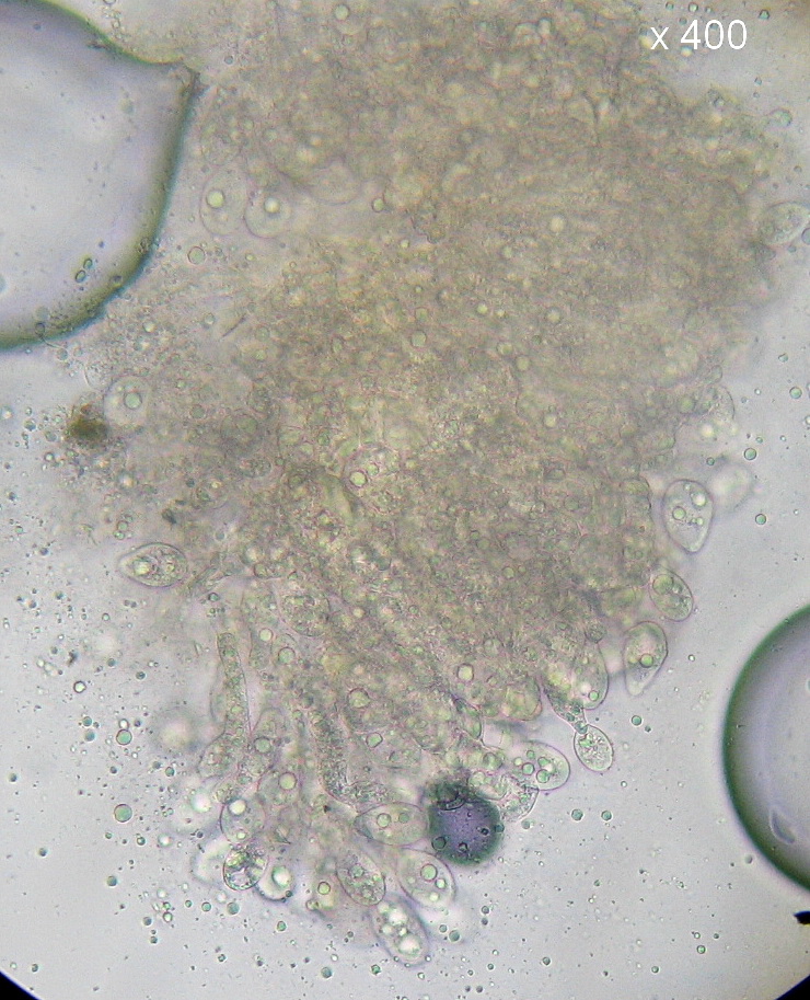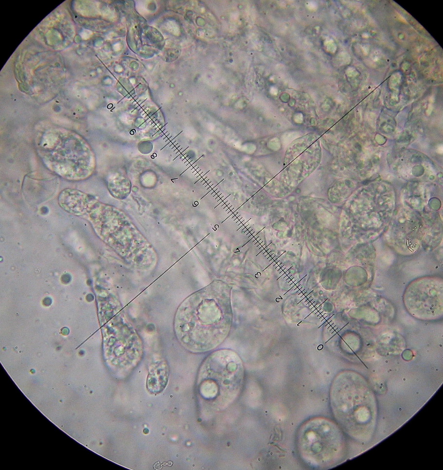 Die verm. Primärkonidien liegen so um 25 x15µ mit öligem Inhalt.
