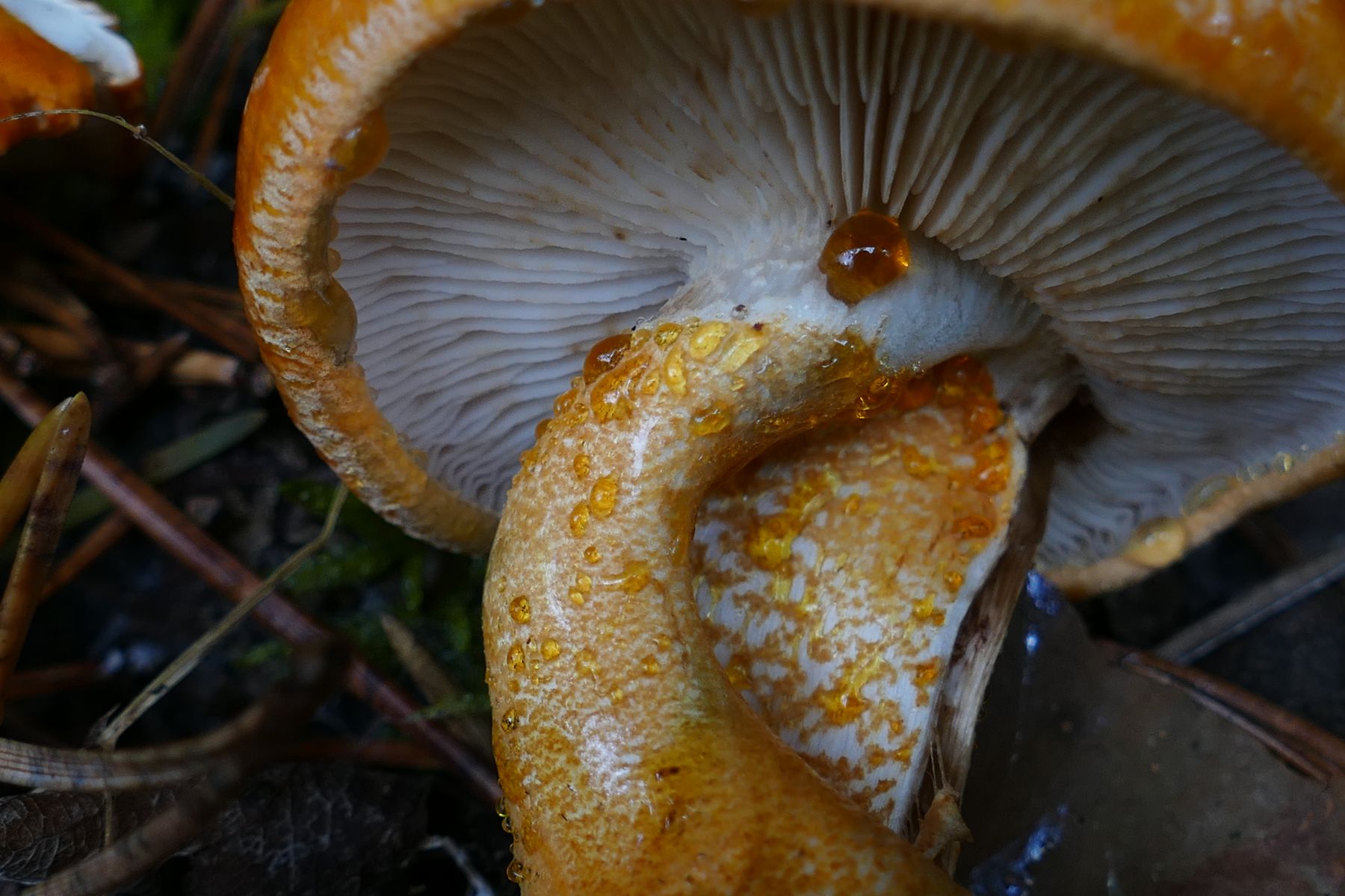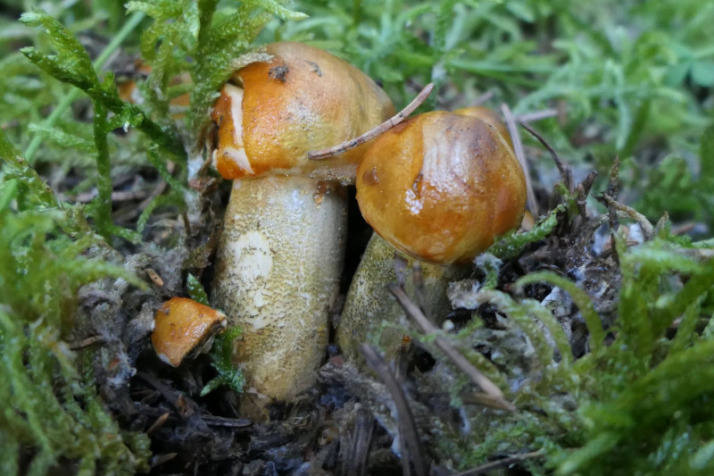 02 Gomphidius maculatus - den gefleckten Schmierling bei 03 Suillelus grevillei - dem Gorldröhrling (die hatte ich allerdings erst abends an einer Waldkante unter Lärchen):