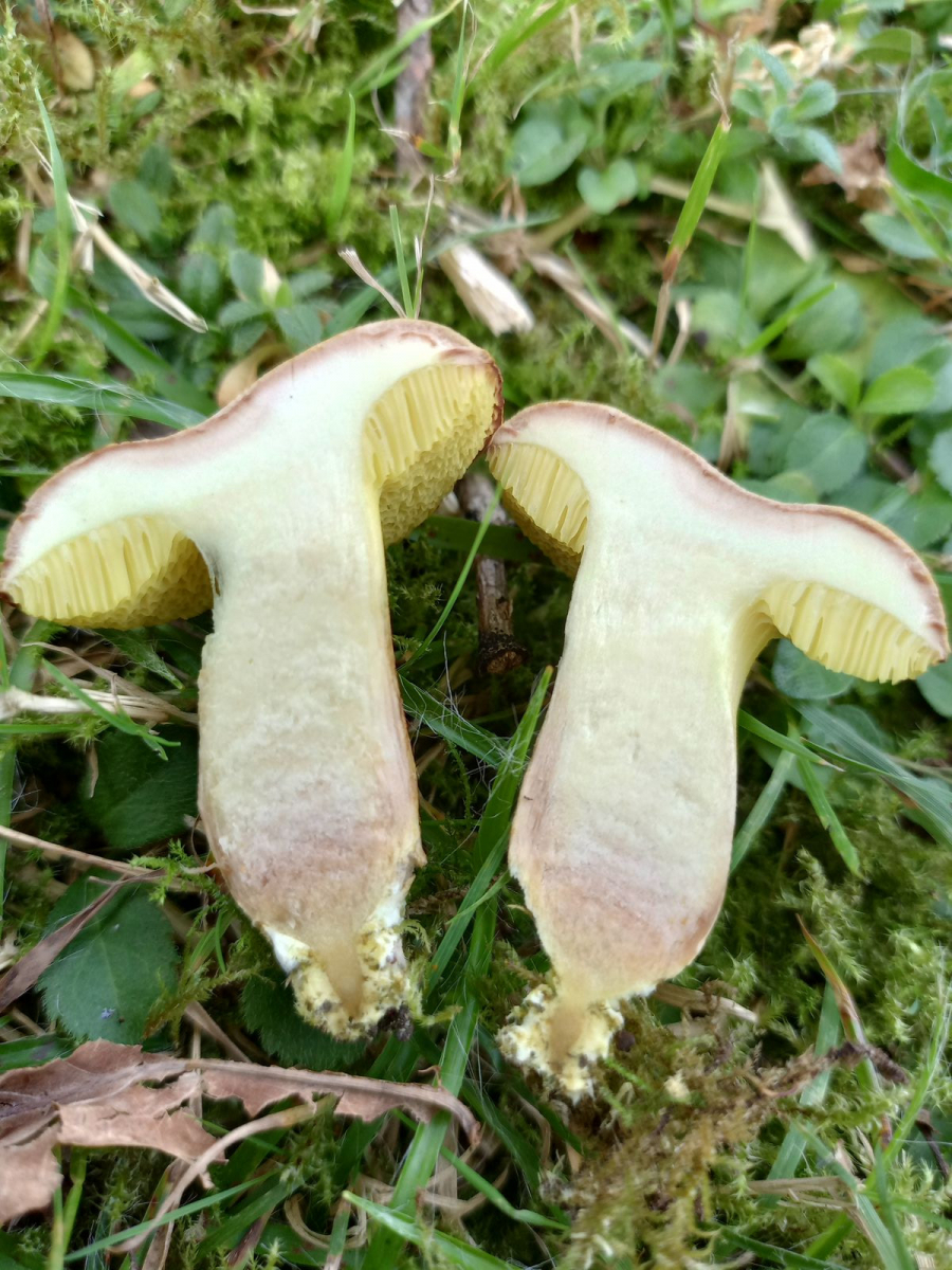 ich bin hier beim Braunen Filzröhrling, die Ziegenlippe wird dreifarbig im Schnittbild von oben nach unten Blau-Gelb-Rotbraun.
