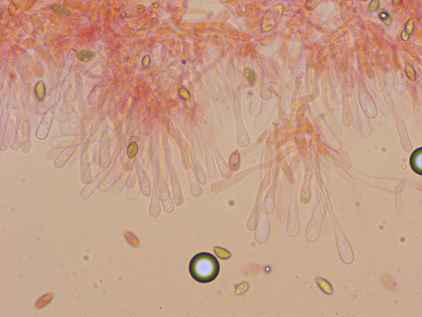Basidien 4-sporig, Schnallen vorhanden. Es gab ein paar zystidenartige Zellen an der Schneide, nichts eindeutiges.