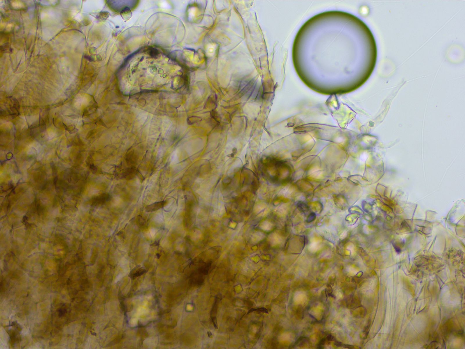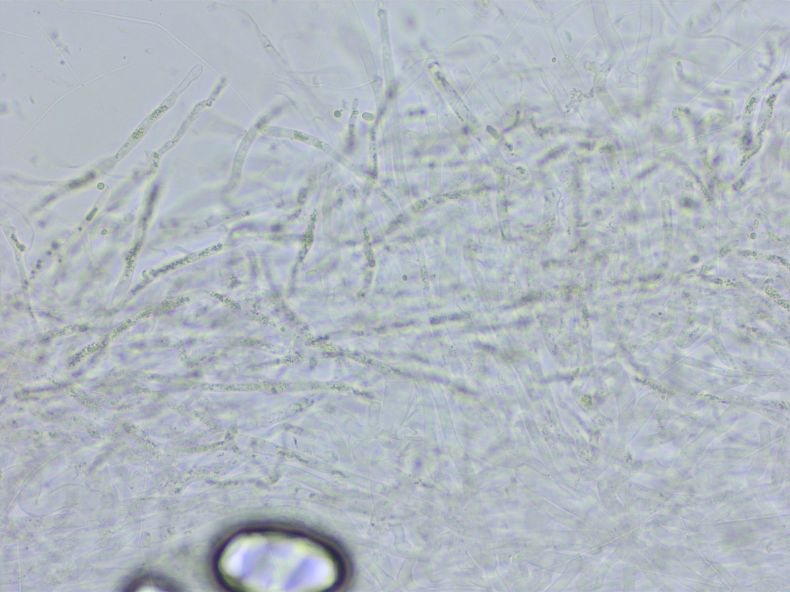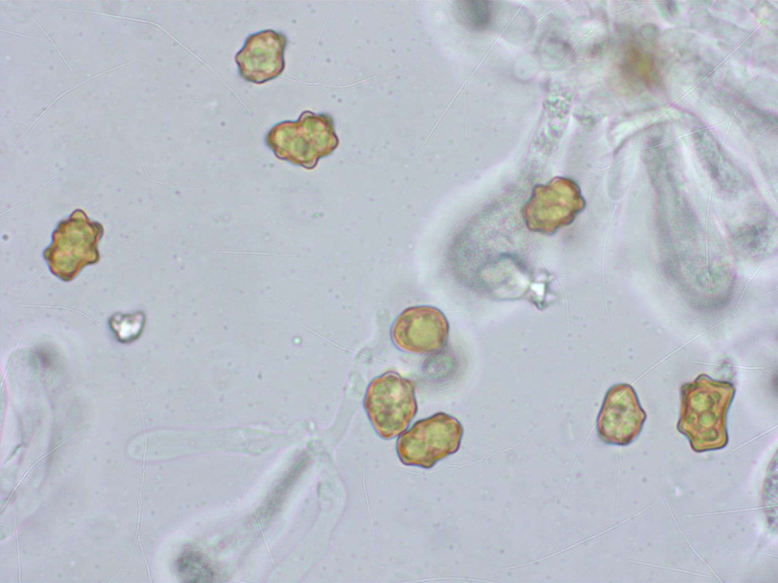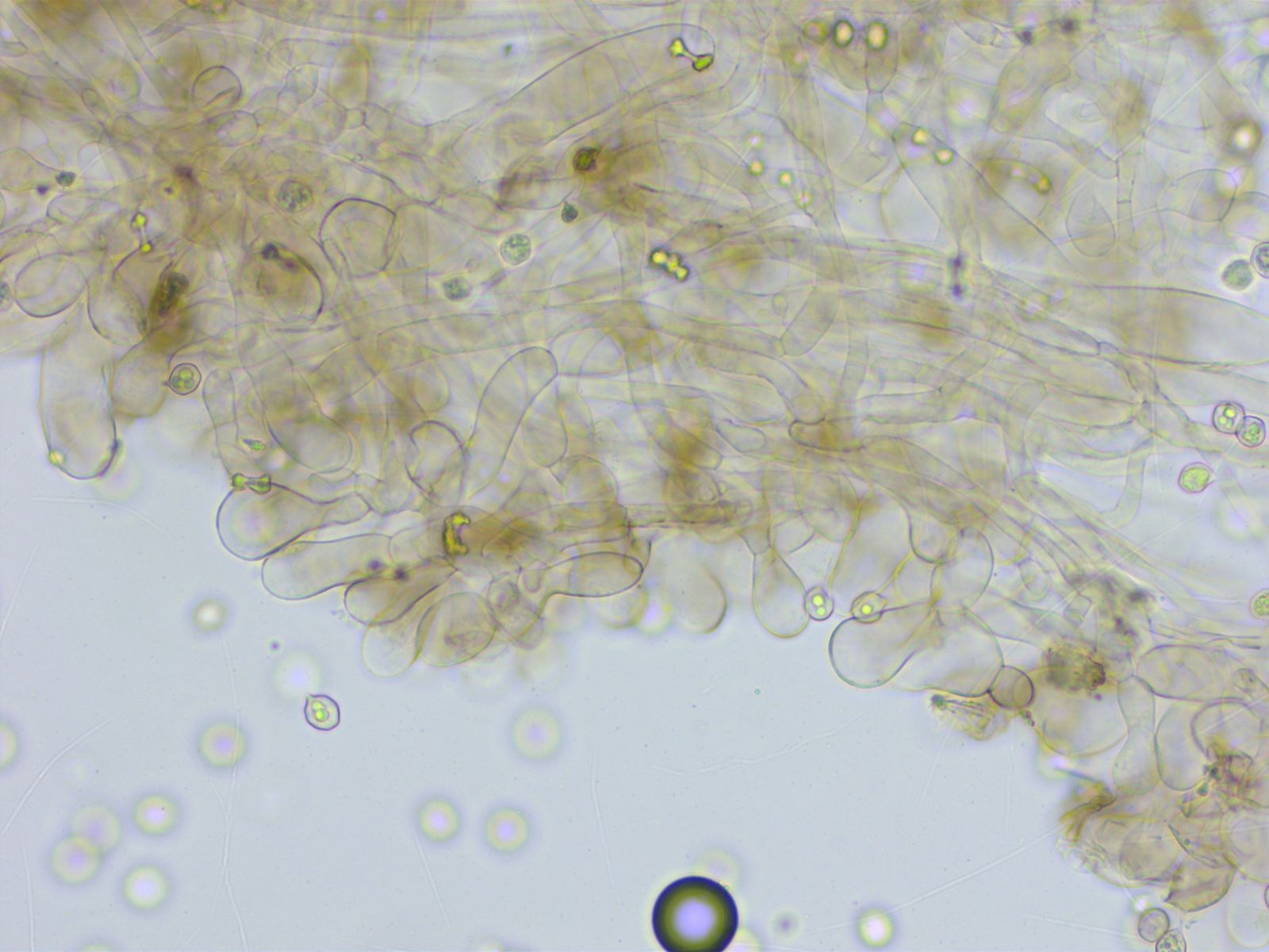 Basidien 4-sporig, Schnallen vorhanden. Es gab ein paar zystidenartige Zellen an der Schneide, nichts eindeutiges.