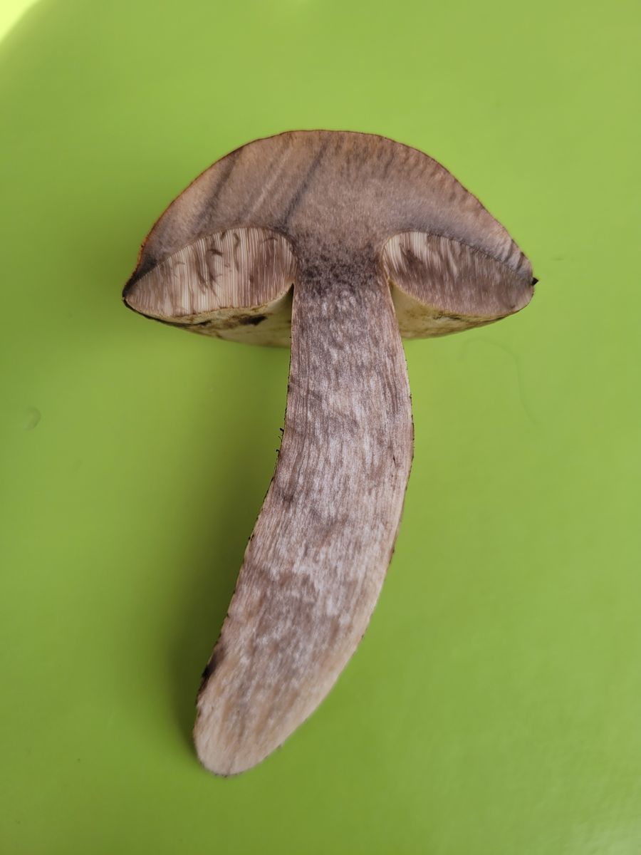 Beim Anschneiden ist das Fleisch zunächst weiß und färbt sich dann in etwa 5 Minuten dunkel, wie auf dem Bild zu sehen.