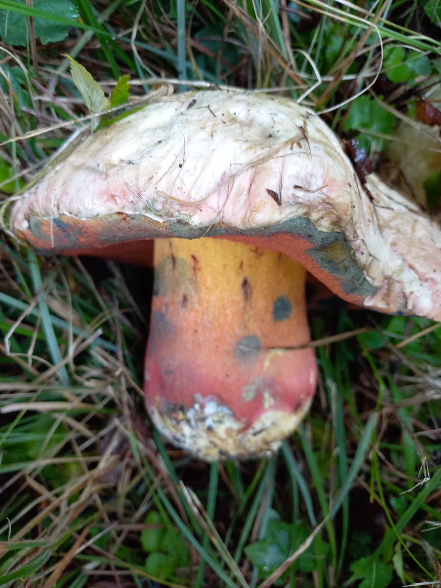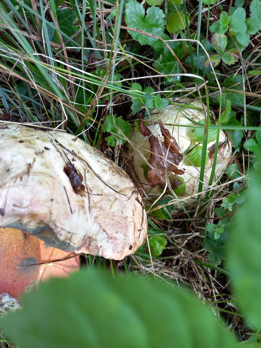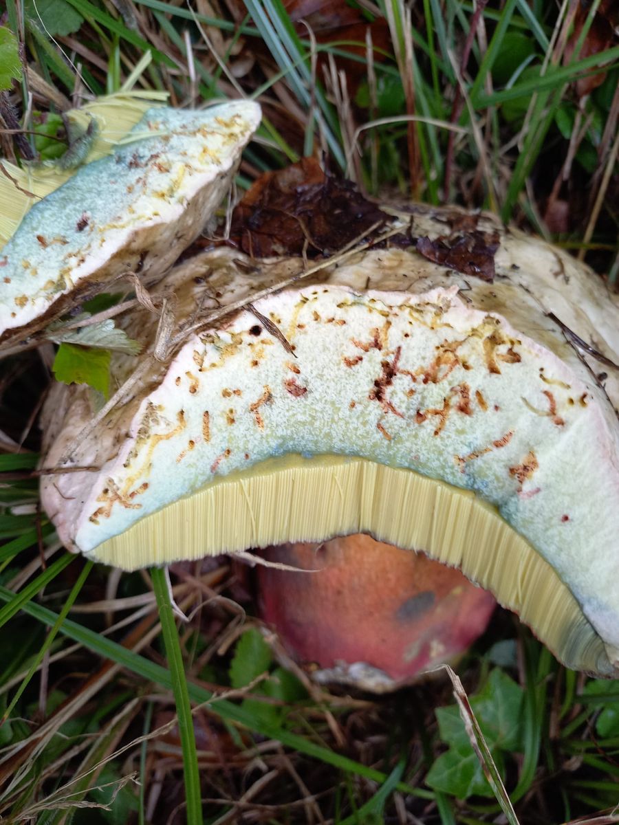 gestern war ich in einem Mischwald unterwegs auf ca. 360 m, kalkreicher Boden. Auf dem Rückweg zum Auto sah ich im Gras auf einer Böschung (Waldrand) etwas sehr großes, rund und grau/schmutzig weiß. Ich stellte fest, dass es sich um einen sehr großen und schweren (geschätzte 500 gr.) handelte. Zuerst dachte ich an einen Schönfuß, aber die Huthaut und die Röhren passten nicht. Also kam mir der Gedanke, dass es sich um einen Satans-Röhrling handeln könnte. Das wäre für mich ein fantastischer Perser!!!!
