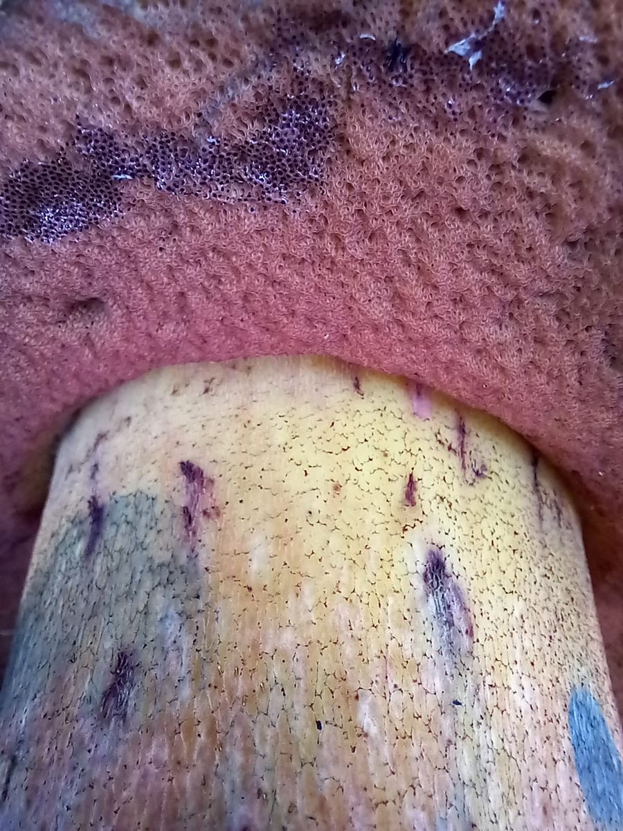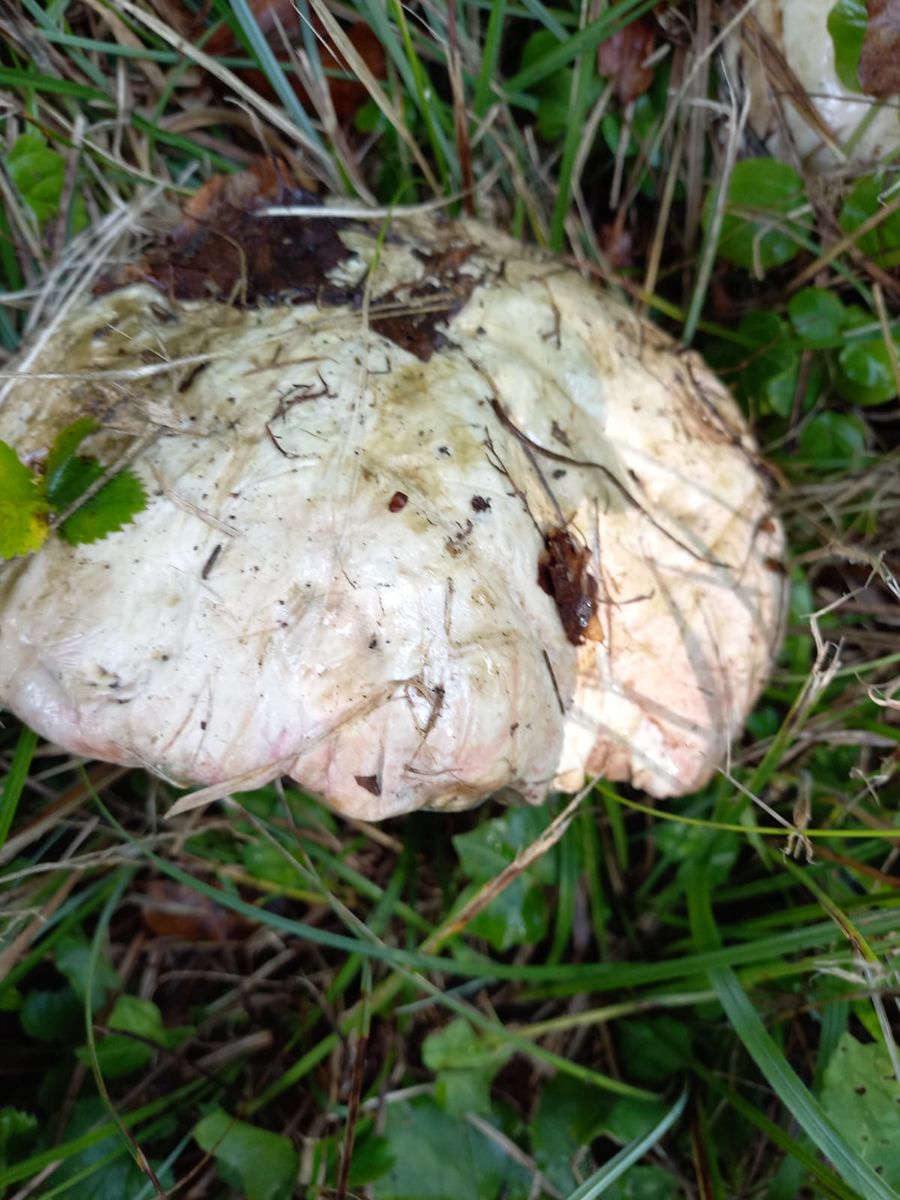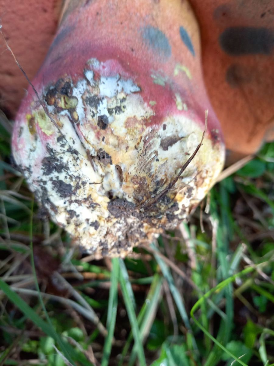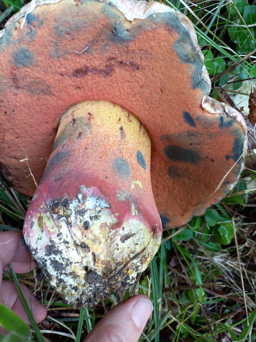 gestern war ich in einem Mischwald unterwegs auf ca. 360 m, kalkreicher Boden. Auf dem Rückweg zum Auto sah ich im Gras auf einer Böschung (Waldrand) etwas sehr großes, rund und grau/schmutzig weiß. Ich stellte fest, dass es sich um einen sehr großen und schweren (geschätzte 500 gr.) handelte. Zuerst dachte ich an einen Schönfuß, aber die Huthaut und die Röhren passten nicht. Also kam mir der Gedanke, dass es sich um einen Satans-Röhrling handeln könnte. Das wäre für mich ein fantastischer Perser!!!!