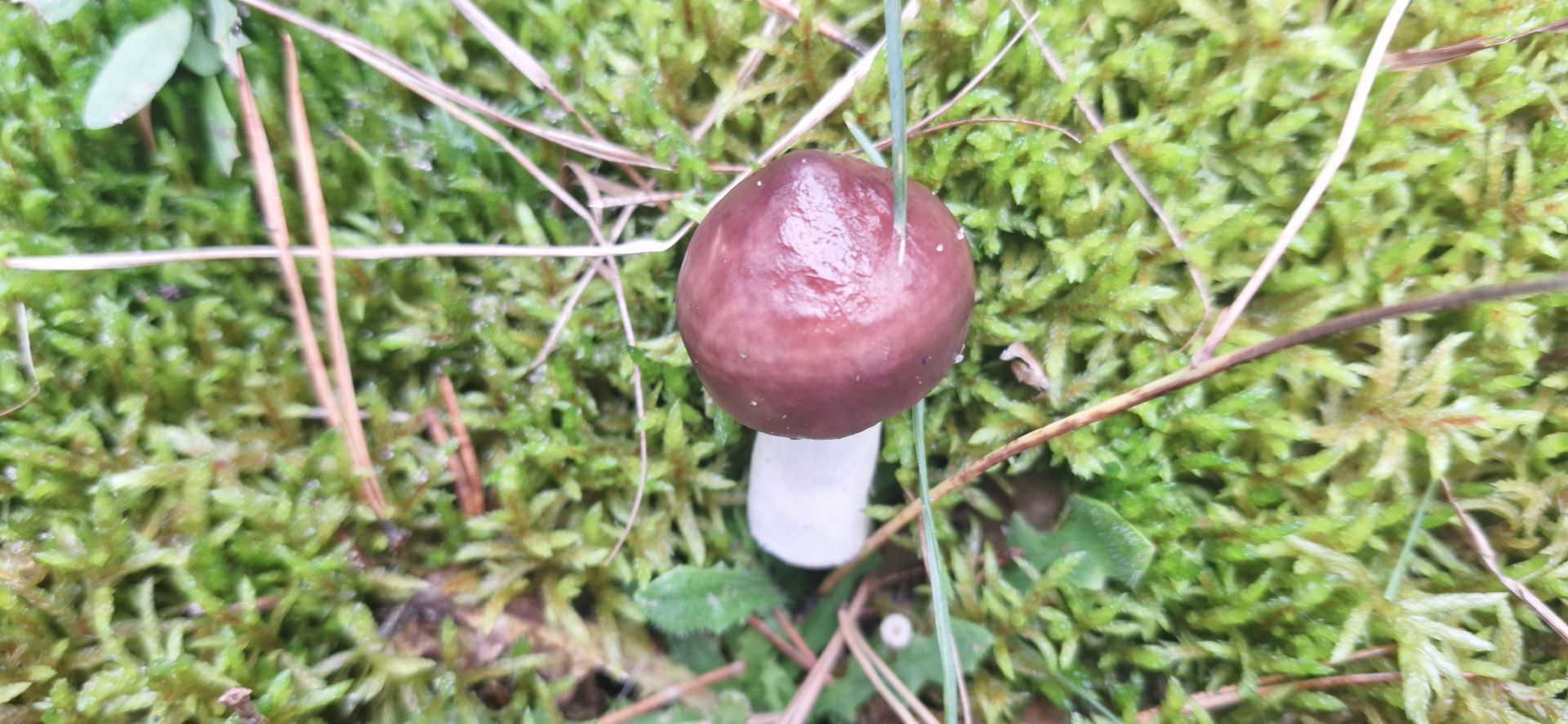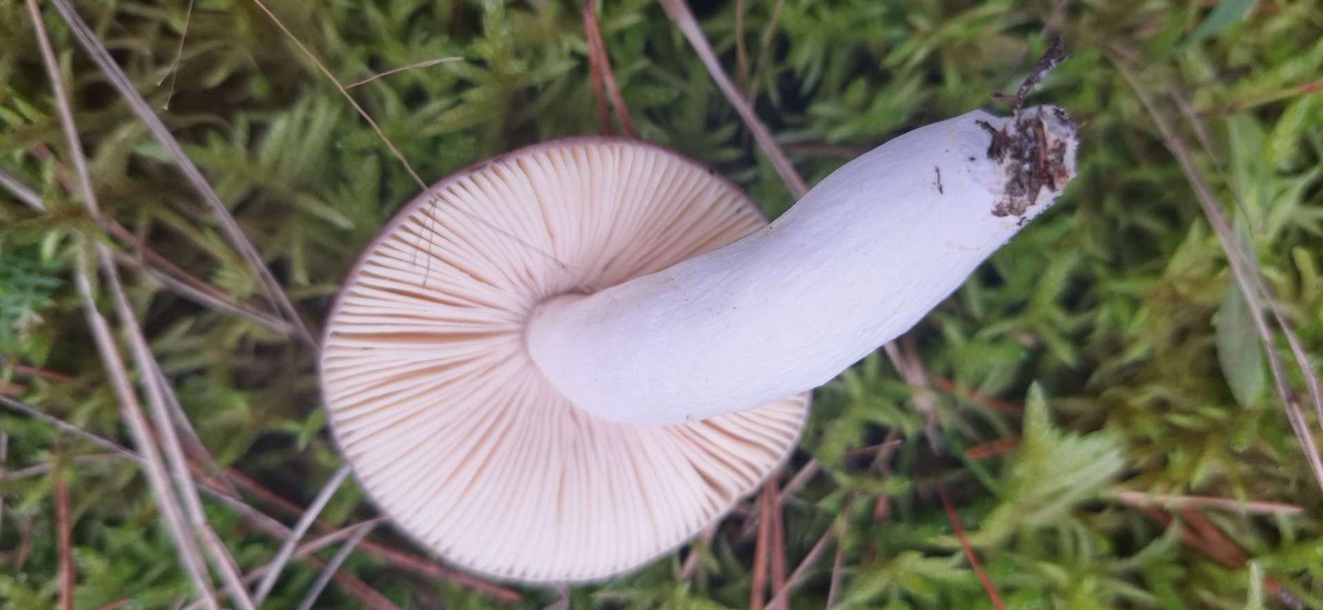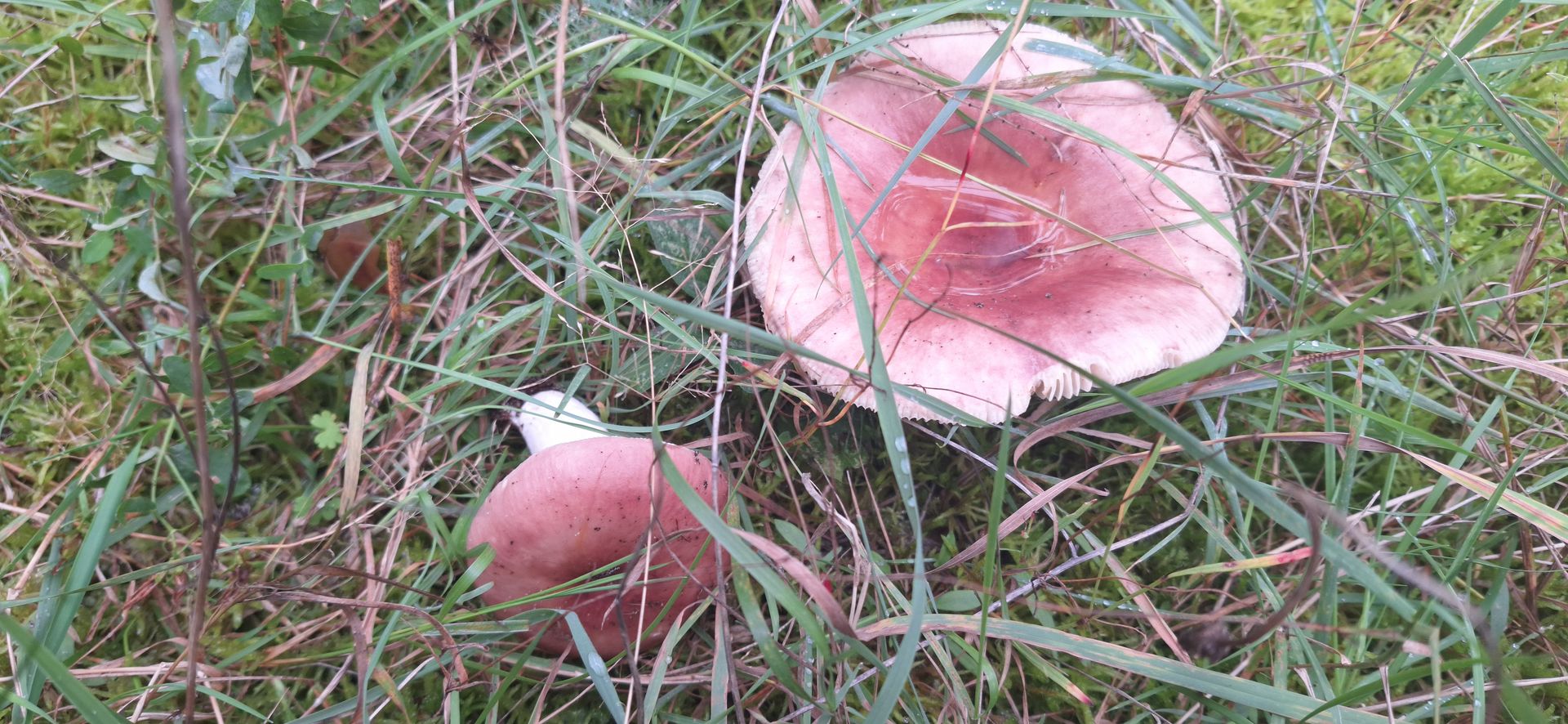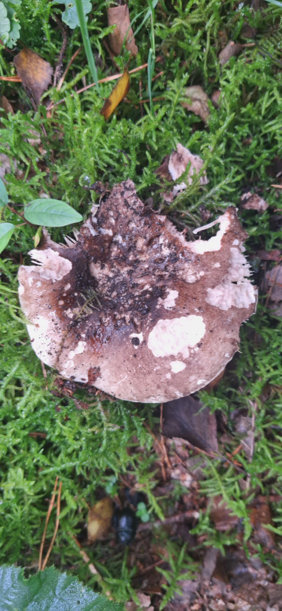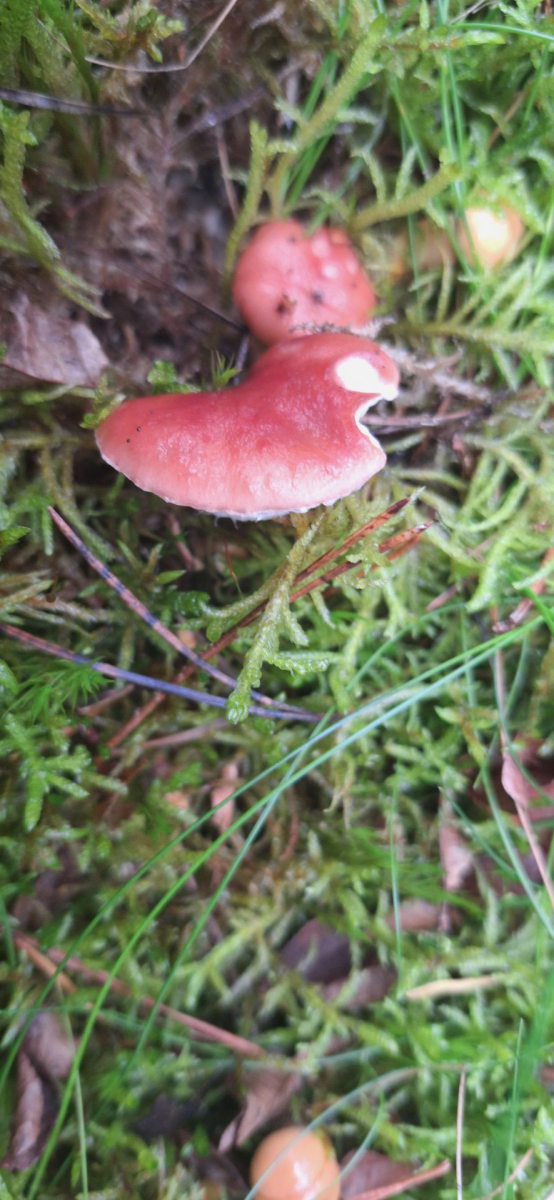 5. Ein weiterer Erstfund, Bild leider nicht gut wegen Regen, das ist meiner Meinung nach Russula decolorans - der Orangerote Graustieltäubling, Fundort im Moor direkt am Fuße einer großen alten Kiefer in dickem Moospolster. Geschmack mild, ganz leichte Schärfe wahrnehmbar, Geruch recht neutral, bei Verletzung zuerst rötend, dann grauend, am Anschnitt recht schnell grauend. Hutrand gerieft. Lammellen weißlich, brüchig.