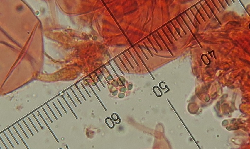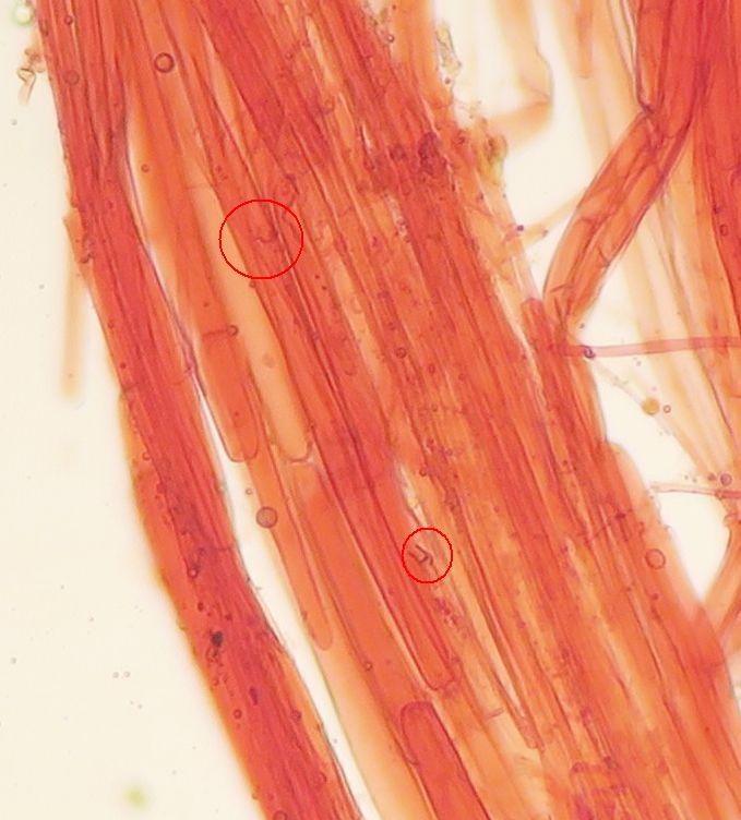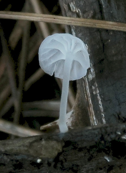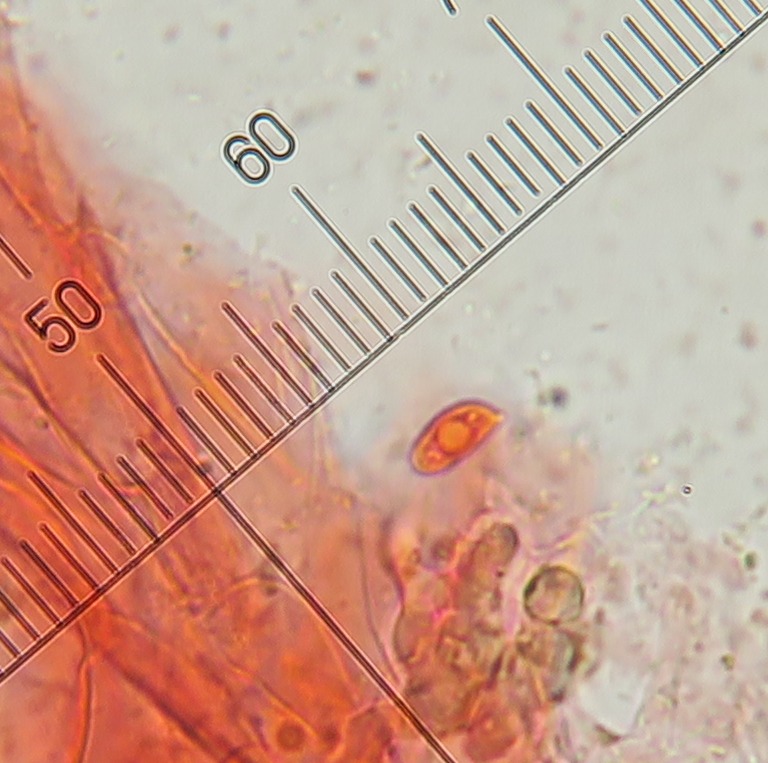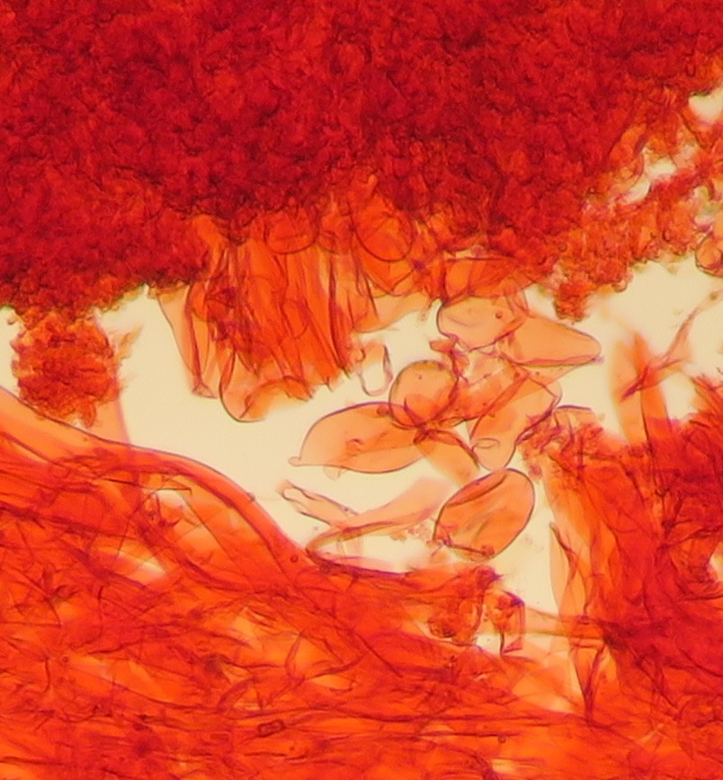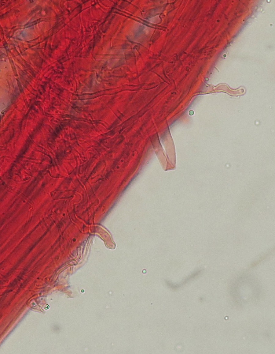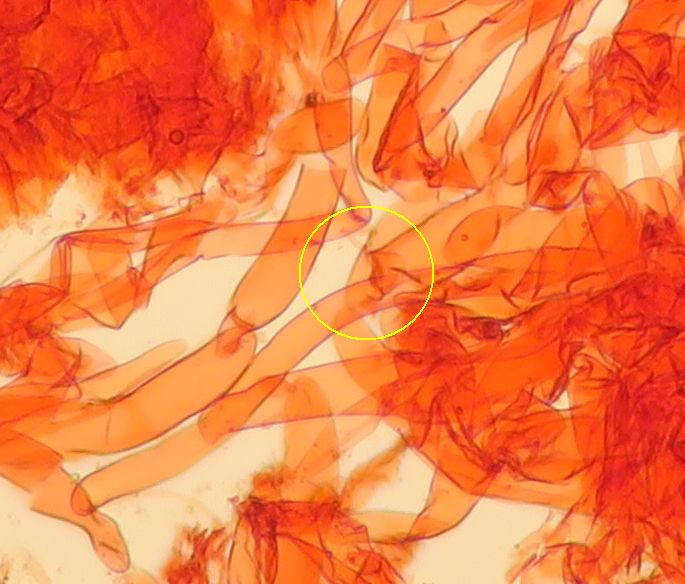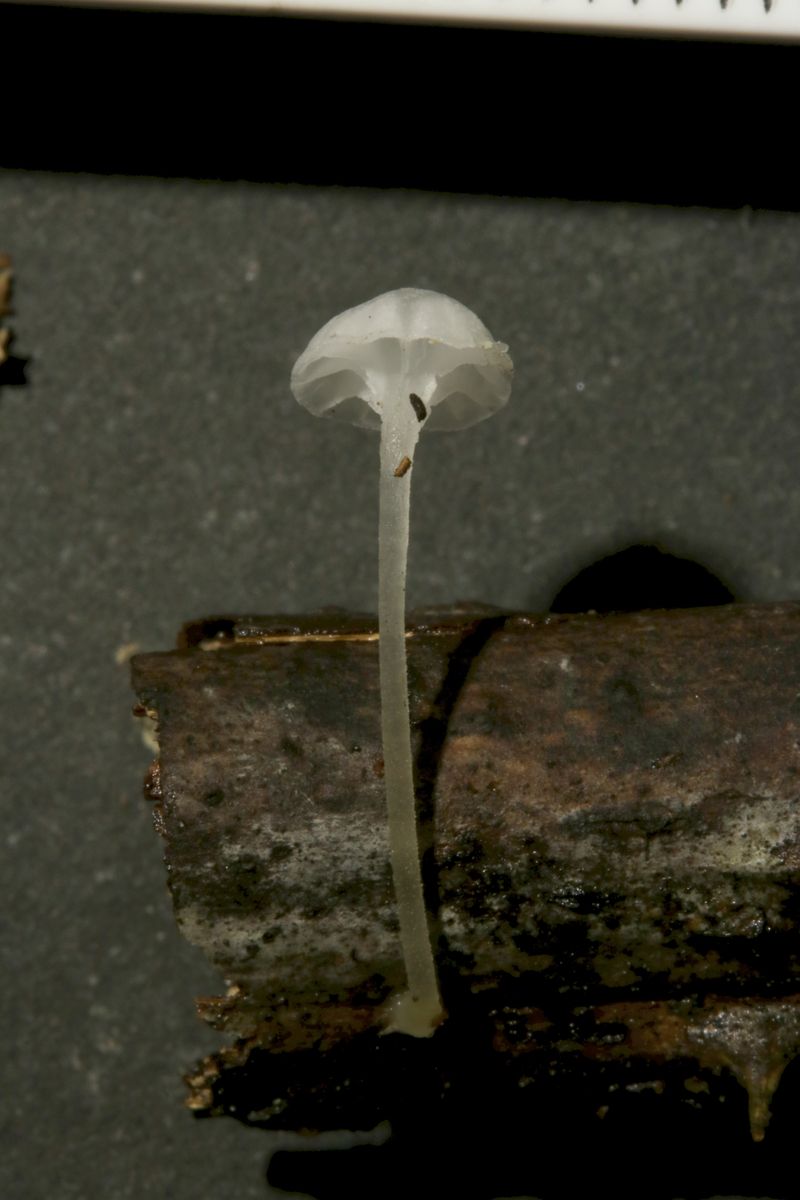 Some time ago I have found a cluster of small Mycena growing on decaying bramble sticks (Rubus ulmifolius) having a purely white and slightly transparent colour (esp. the stipe), fading a bit into beige when old. Cap 7-12 mm wide with non-numerous, spaced (not crowded) lamellae, horizontally-arched not particularly decurrent. Basidia 4-sporous (sometimes 2). There were swollen hyphae from sub-globose to broadly cylindrical, sometimes with a short foot (sphaeropedunculate) which I think were cheilo or/and pleuro cystidia (40-90 x 25-50 um). Spores 8-10 x 4.5-6 um (Q 1.5-1.9) ovate-elliptical to moderately broadly ovate, very rare to find in slides. I didn't check well the pileipellis. The stipe was more or less glabrous but I think I got a slide showing some caulocystidia.