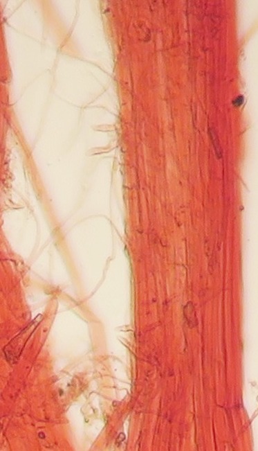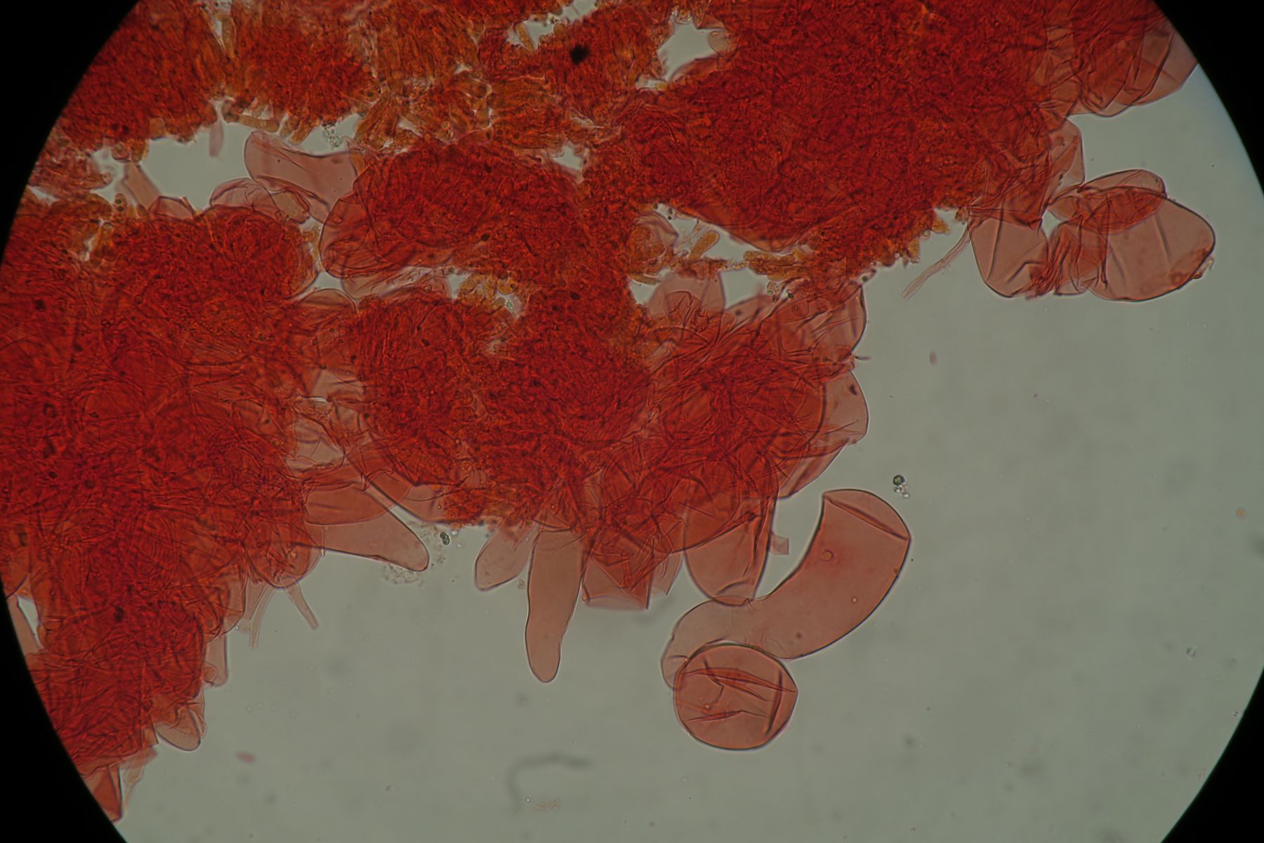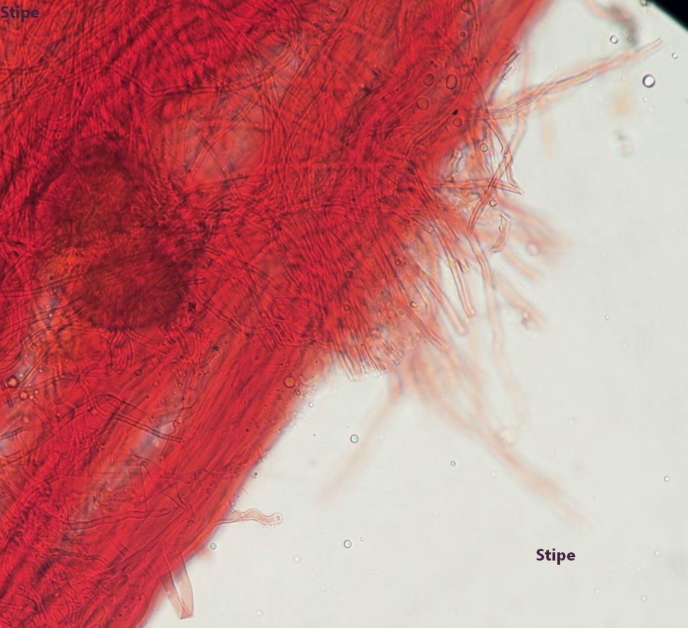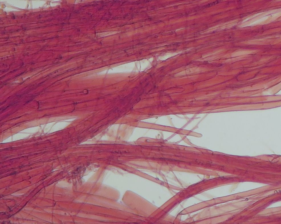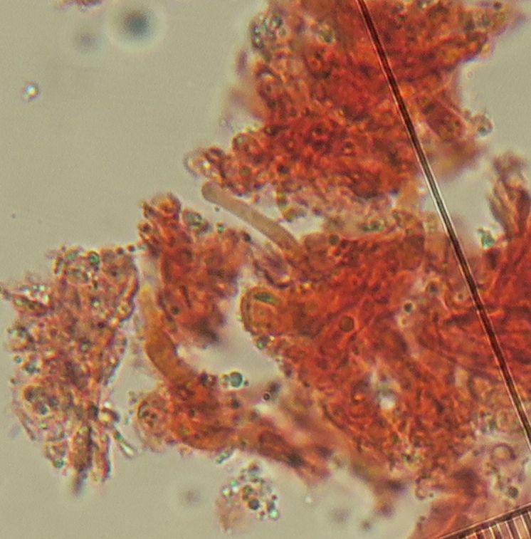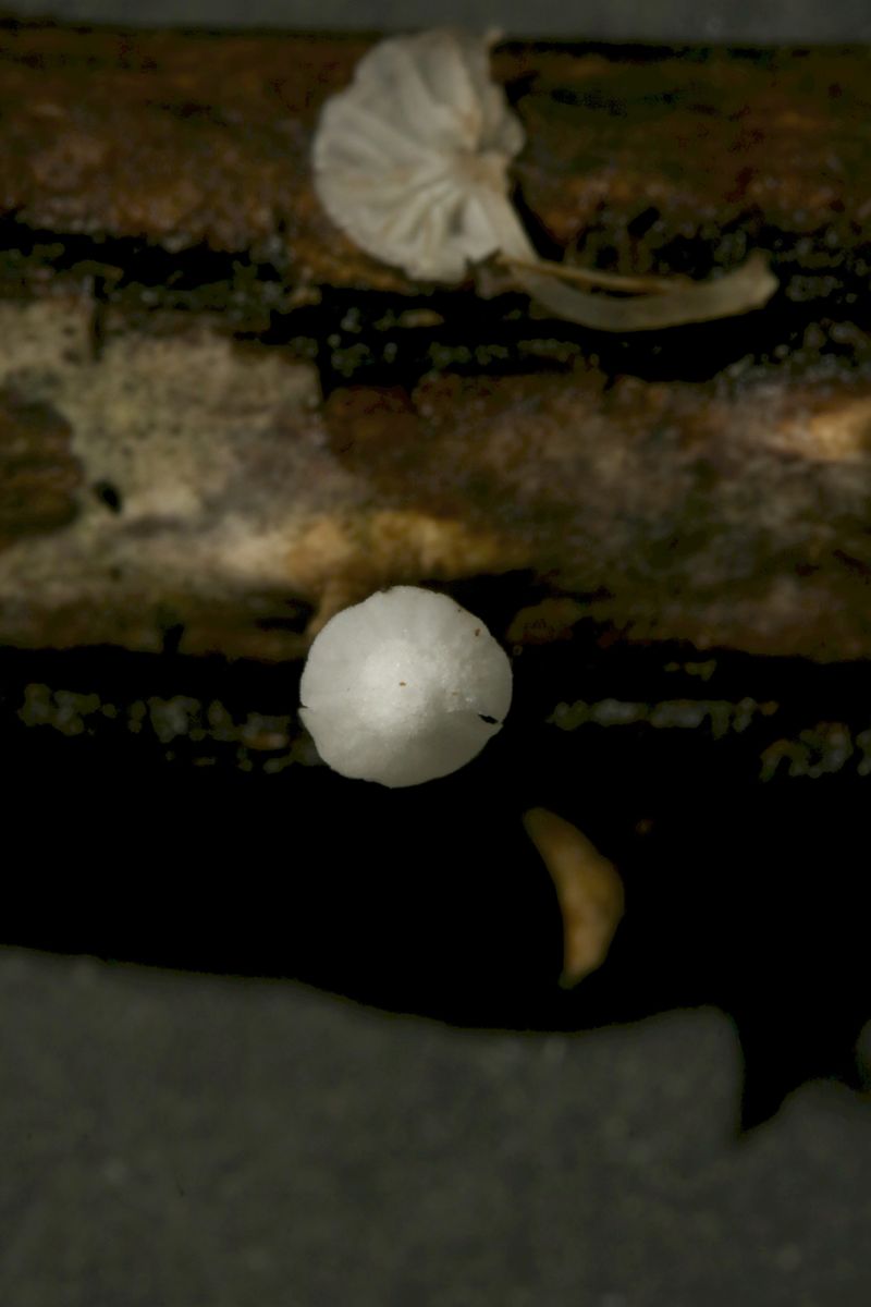 Some time ago I have found a cluster of small Mycena growing on decaying bramble sticks (Rubus ulmifolius) having a purely white and slightly transparent colour (esp. the stipe), fading a bit into beige when old. Cap 7-12 mm wide with non-numerous, spaced (not crowded) lamellae, horizontally-arched not particularly decurrent. Basidia 4-sporous (sometimes 2). There were swollen hyphae from sub-globose to broadly cylindrical, sometimes with a short foot (sphaeropedunculate) which I think were cheilo or/and pleuro cystidia (40-90 x 25-50 um). Spores 8-10 x 4.5-6 um (Q 1.5-1.9) ovate-elliptical to moderately broadly ovate, very rare to find in slides. I didn't check well the pileipellis. The stipe was more or less glabrous but I think I got a slide showing some caulocystidia.