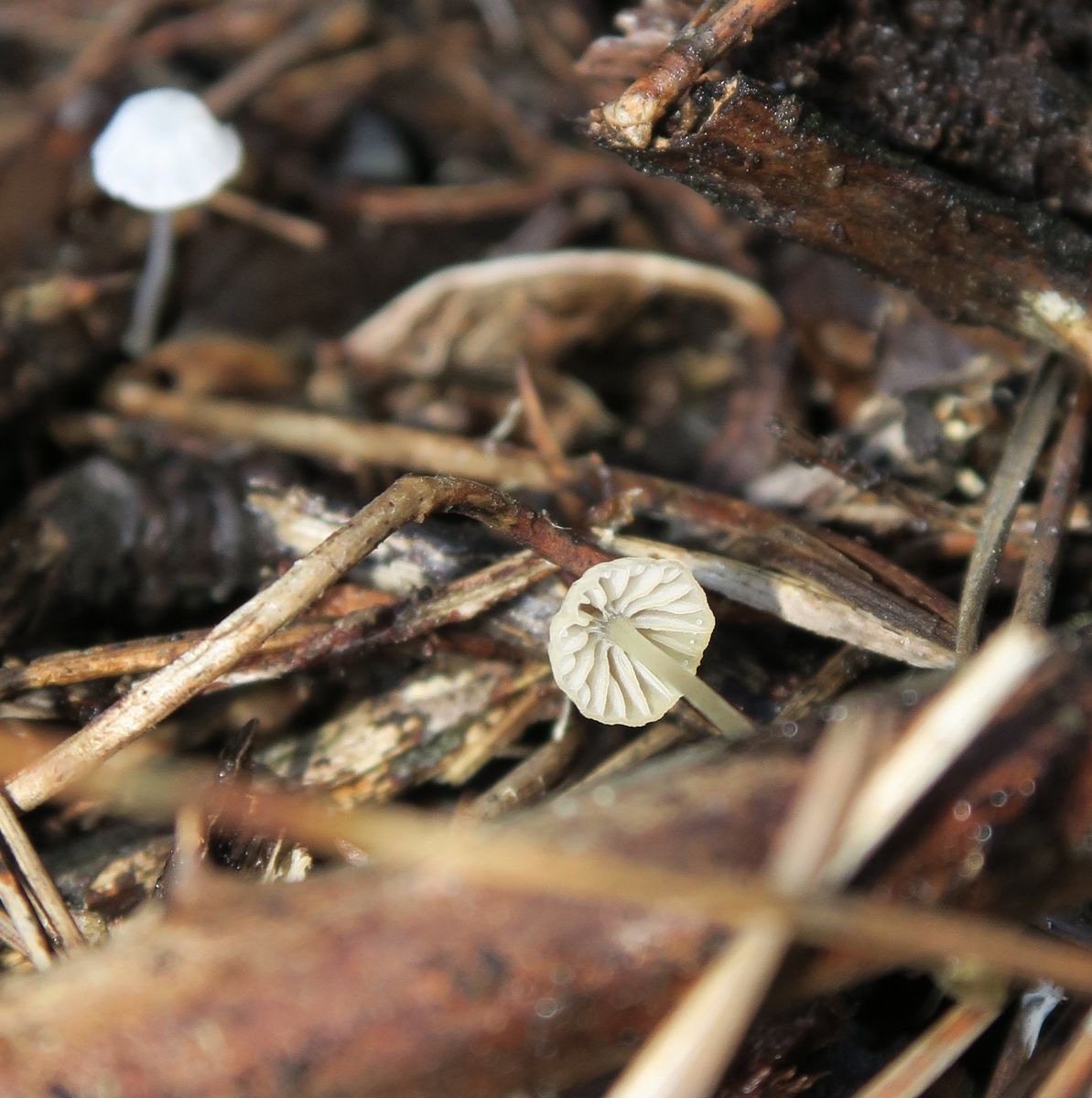 I shortlisted to Hemimycena gracilis, Mycena alba, Mycena pseudolactea, Mycene spiraea