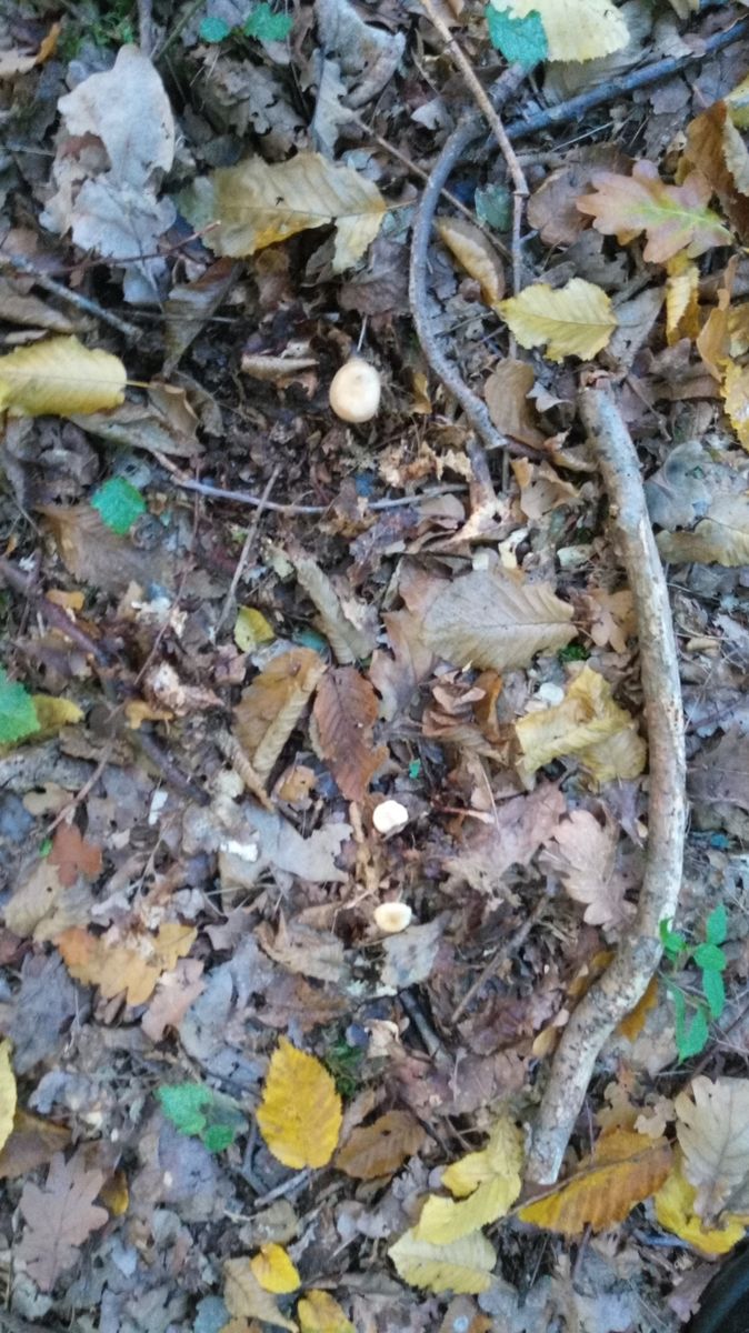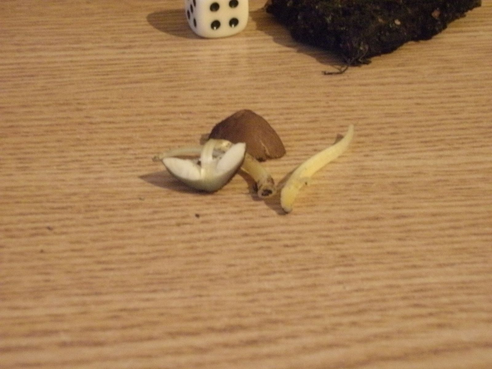 Nicht weiter fotographiert/mitgenommen habe ich noch einen Ansatz von wohl einem goldgelben Zitterling (aber noch sehr klein, könnte auch was anderes werden?), einen sehr überständigen Perlpilz (zumindest ein paar rötliche Stellen sichtbar, so intensiv hab ich mir den dann auch nicht angeschaut), und ein paar Babys, die noch fast komplett in ihrer Volva steckten (weiße Lamelenpilze...), Pfennigkrusten, und ein paar wenige Dickröhrlinge (schwarzes Netz, gelbe Röhren, trockener Hut und ziemlich groß mit nicht nachgemessenen 15cm Durckmesser) und einiges an anderen hölzischen Pilzen.