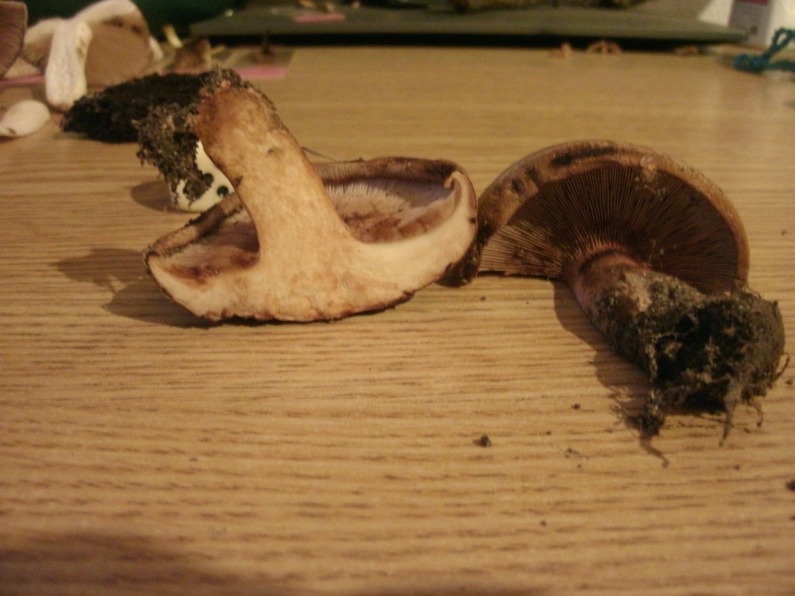 elansatz war ein weißer Flaum zu sehen. Gehört das zum Pilz (Samtfuß ggf?) oder ein Parasit/„Schimmel“/whatever? Oder bin ich da mit Krempling falsch und es ist eher irgendwas Trichterlingsartiges (gibt es da auch noch exzentrisch gesti