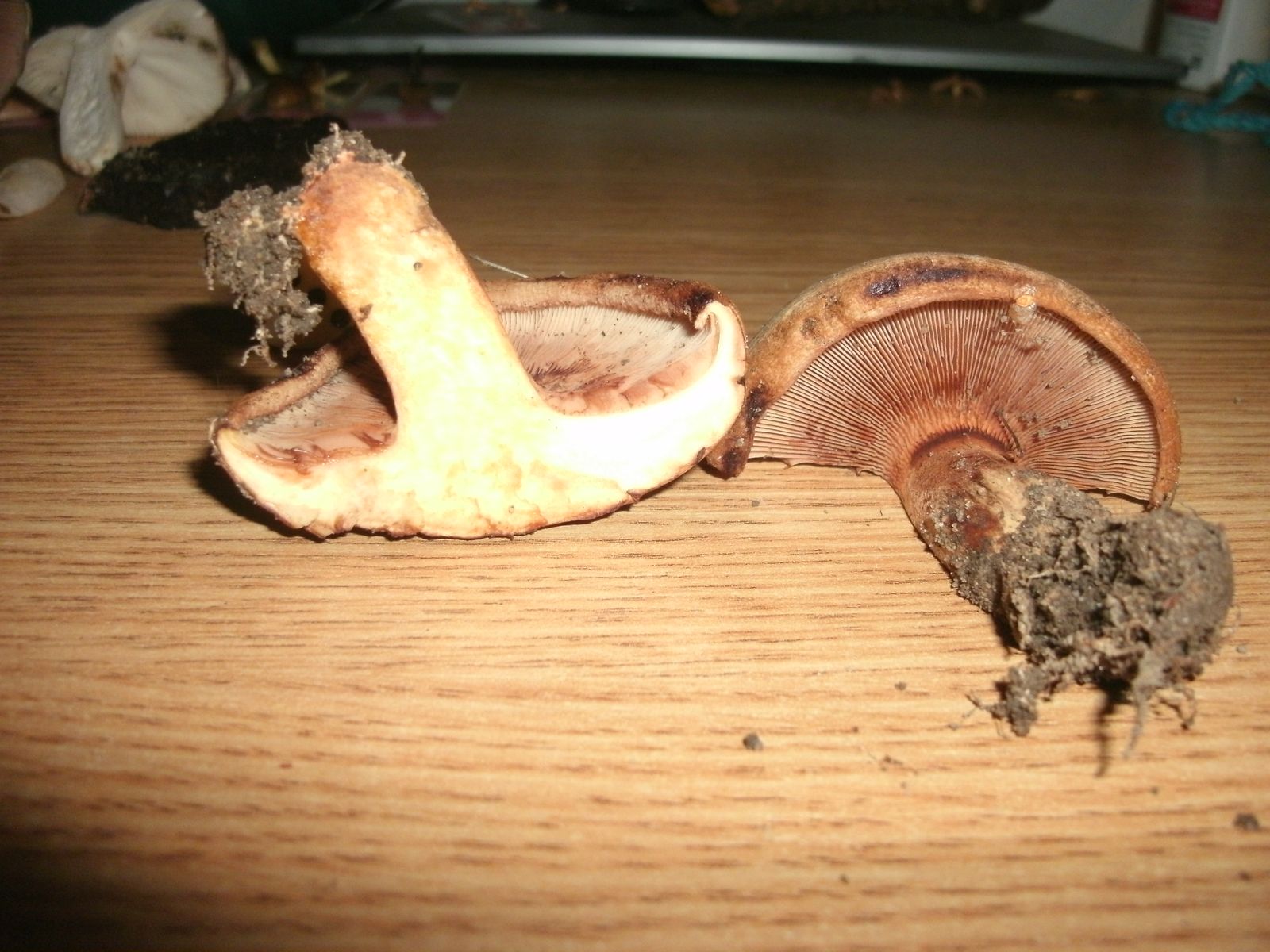 Eine ganze Fläche von ca 2x5m voll mit denen. Exzentrisch gestielte Lamellenpilze, sehr dicht stehende Lamellen, am Ansatz gegabelt. Farbe gelblich, aber im mittleren Bereich dunkel rostbraun verfärbt, Lamellen weit herablaufend. Am Sti