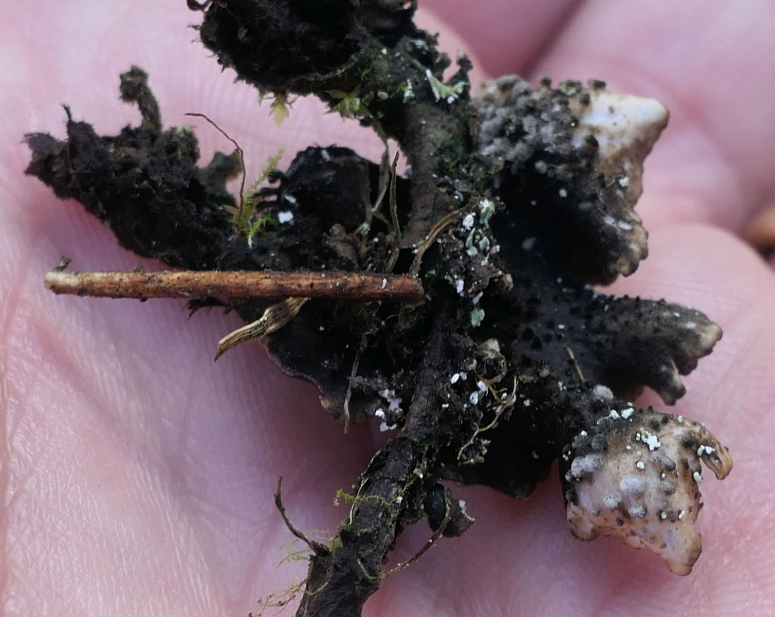 Bild 2 Trockene Peltigeraprobe mit Ästchen auf Unterseite
