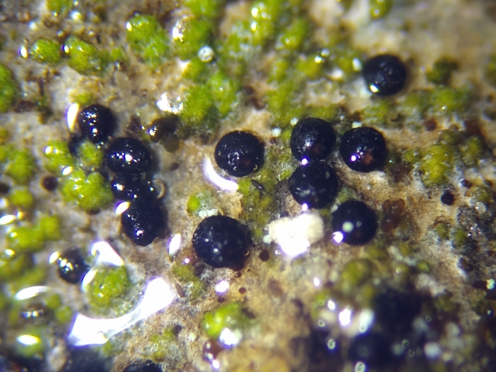 Bild 6 Agonimia tristicula im nassen Zustand - grüne Thallusschüppchen und schwarze Perithecien.