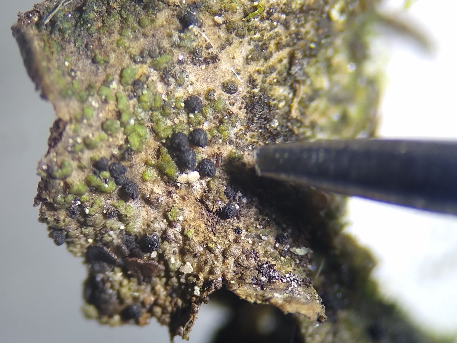 Beim zweiten oder dritten Blick erkennt man die trockenen, braun-grünen Schüppchen neben den Perithecien, den zugehörigen Thallus.