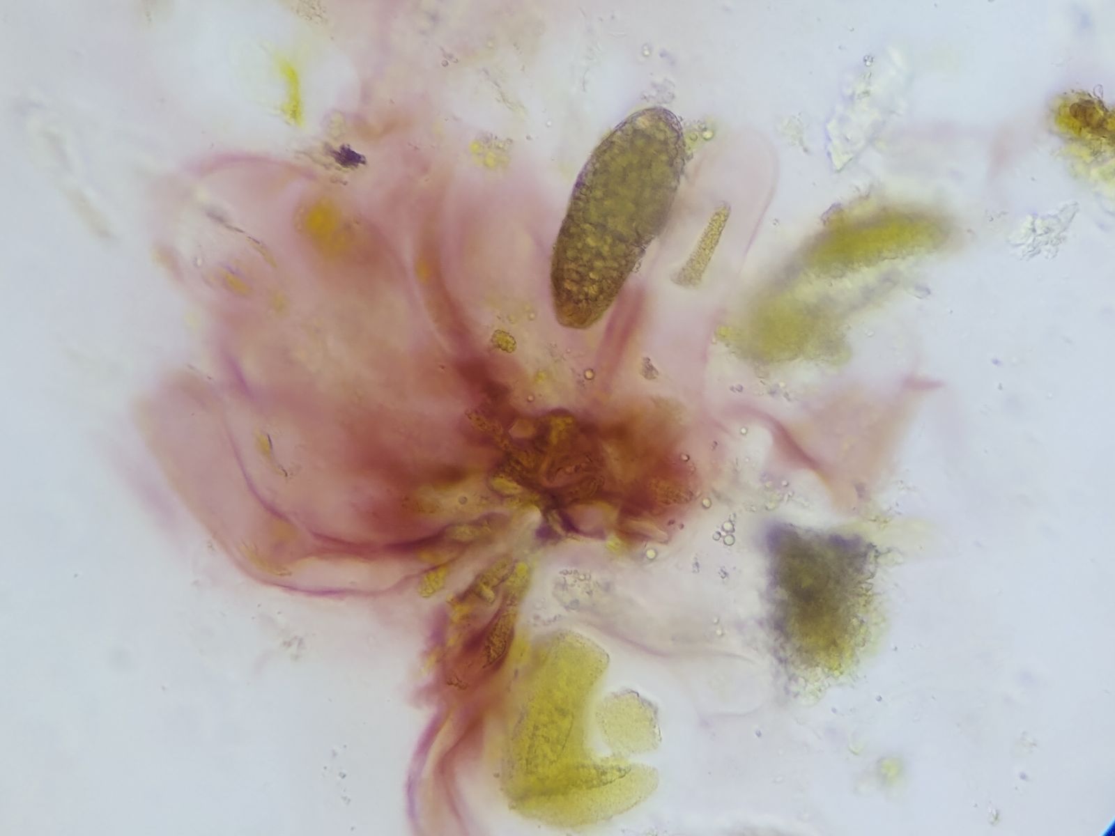 Bild 10 Das Hymenium reagiert J+ kräftig rot