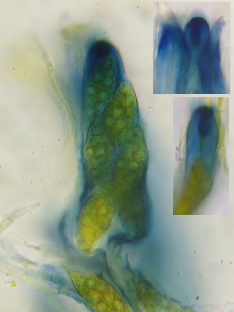 In Lugol reagiert die Ascuswand blau; ein tief reichender, dunkelblauer, zylindrischer Apikalapparat ist gut erkennbar.