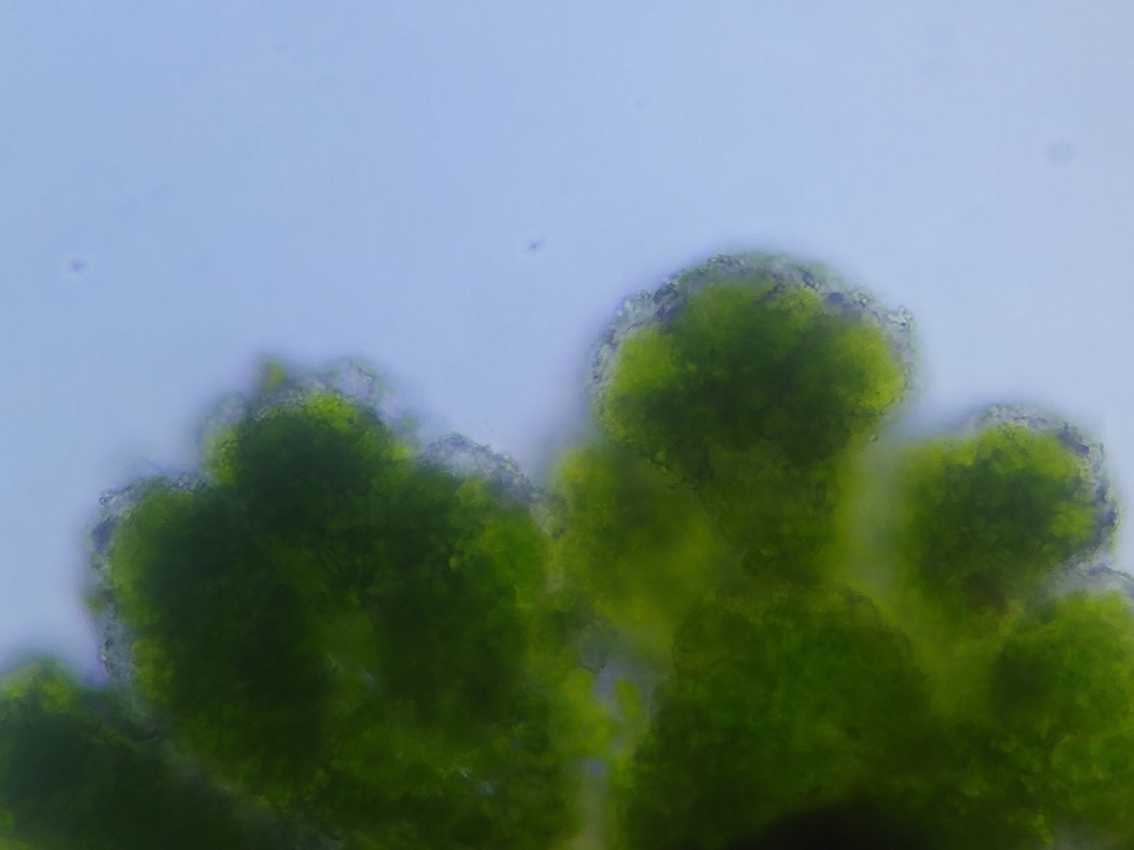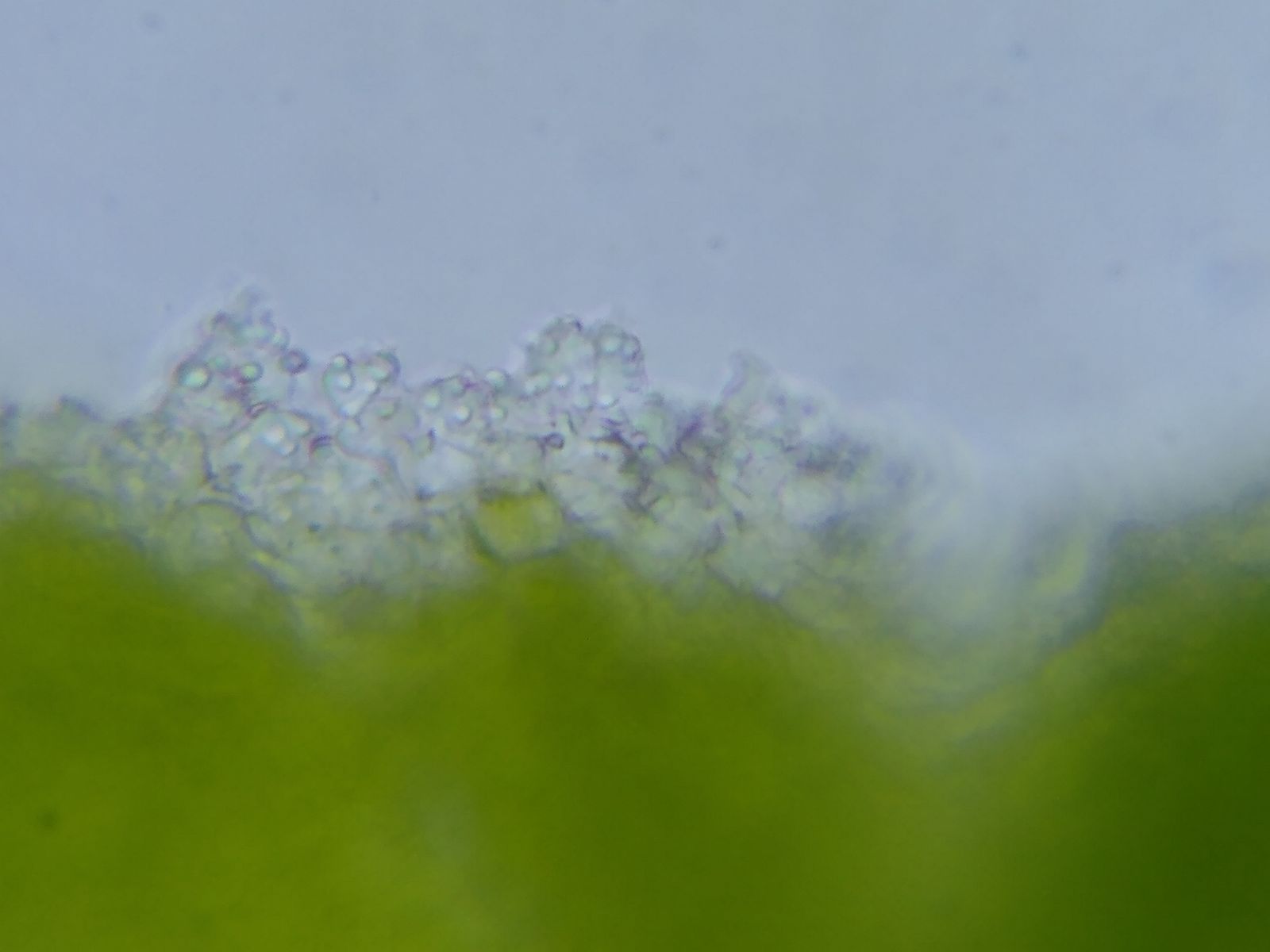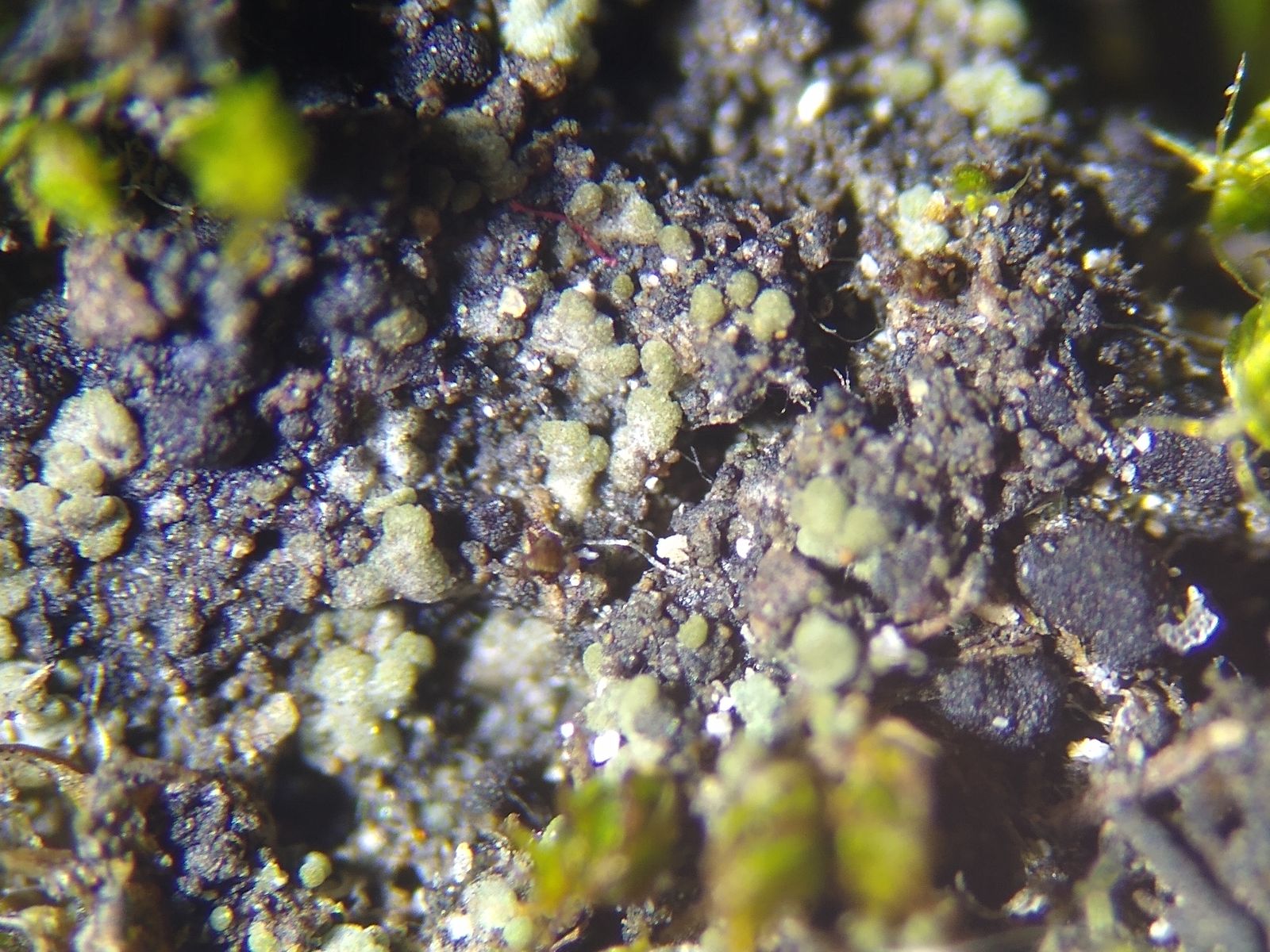 Unter einem flacheren Betrachtungswinkel und stärkerer Vergrößerung wird auch der Thallus erkennbar.