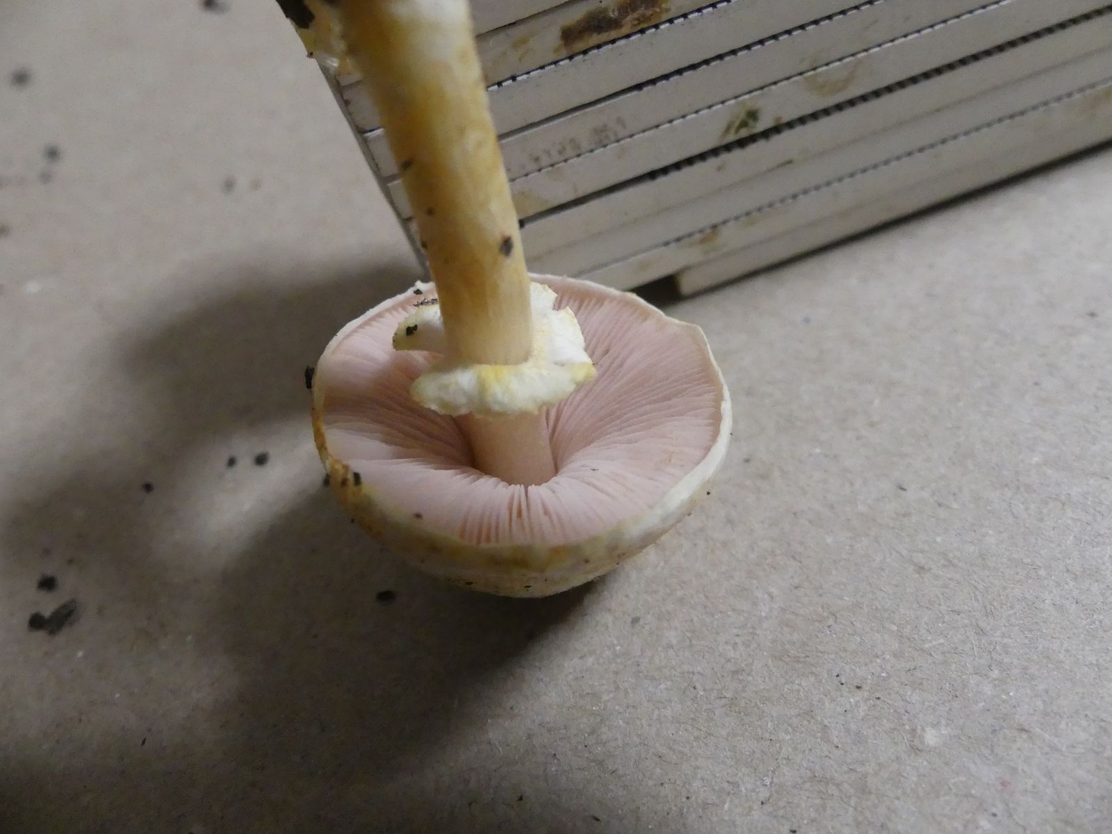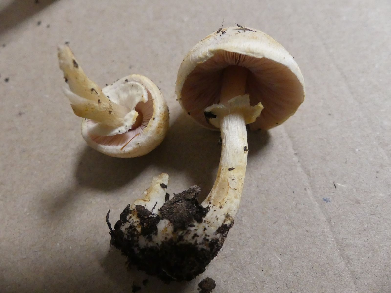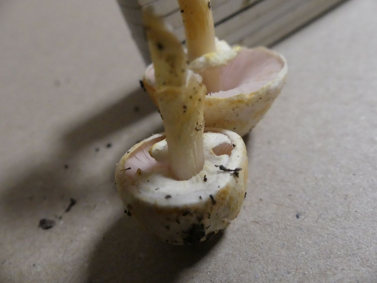 Auf dem Rückweg zum Auto dann noch ein einziger interessanter Fund, nämlich dieses schöne Pärchen. Einen Zwergchampignon hatte ich bei der Draufsicht von oben zunächst gar nicht in Erwägung gezogen. Als ich den angenehm süßen Duft und das Gilben selbst bei vorsichtigem Anfassen bemerkte, ist mir dann wieder die Sektion Minores in die Erinnerung gekommen, die ich selber noch nicht gefunden hatte.