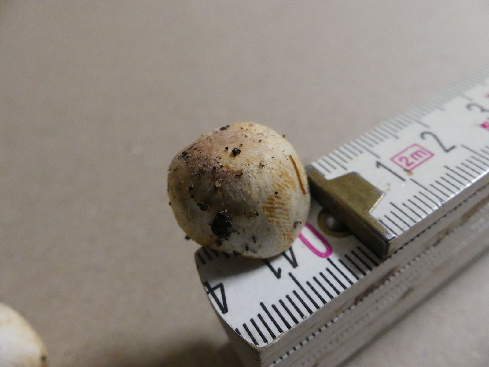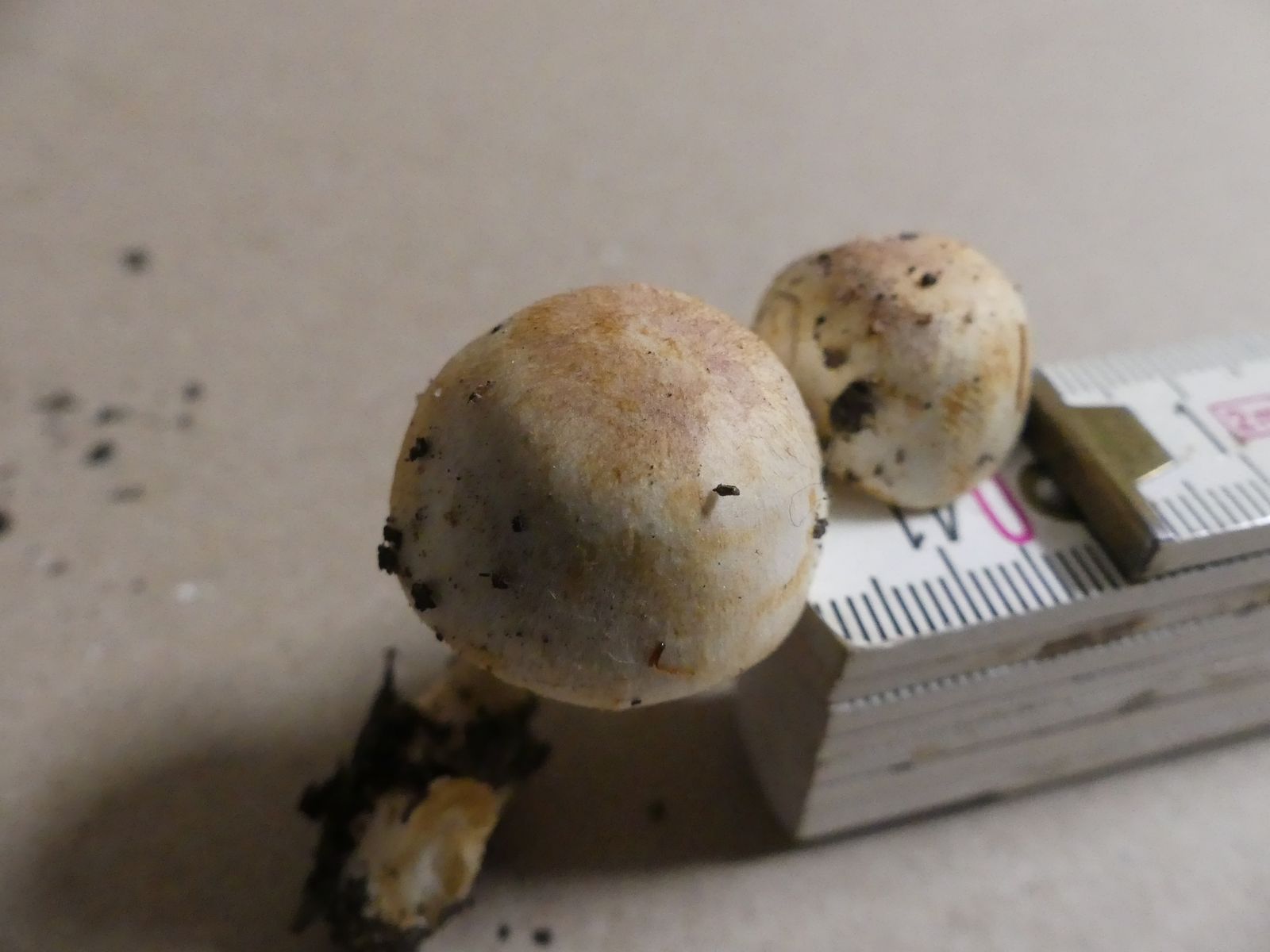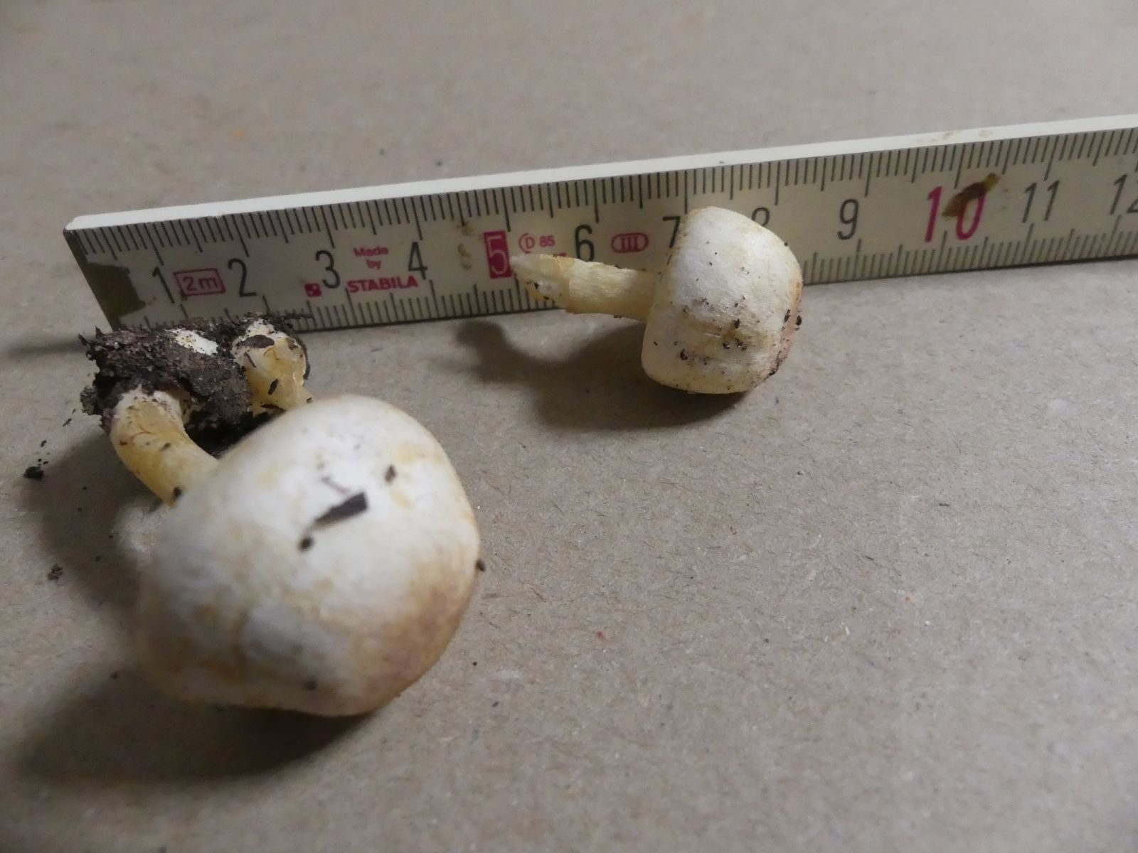 Auf dem Rückweg zum Auto dann noch ein einziger interessanter Fund, nämlich dieses schöne Pärchen. Einen Zwergchampignon hatte ich bei der Draufsicht von oben zunächst gar nicht in Erwägung gezogen. Als ich den angenehm süßen Duft und das Gilben selbst bei vorsichtigem Anfassen bemerkte, ist mir dann wieder die Sektion Minores in die Erinnerung gekommen, die ich selber noch nicht gefunden hatte.