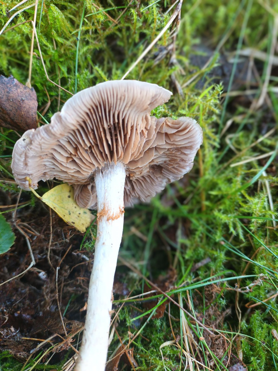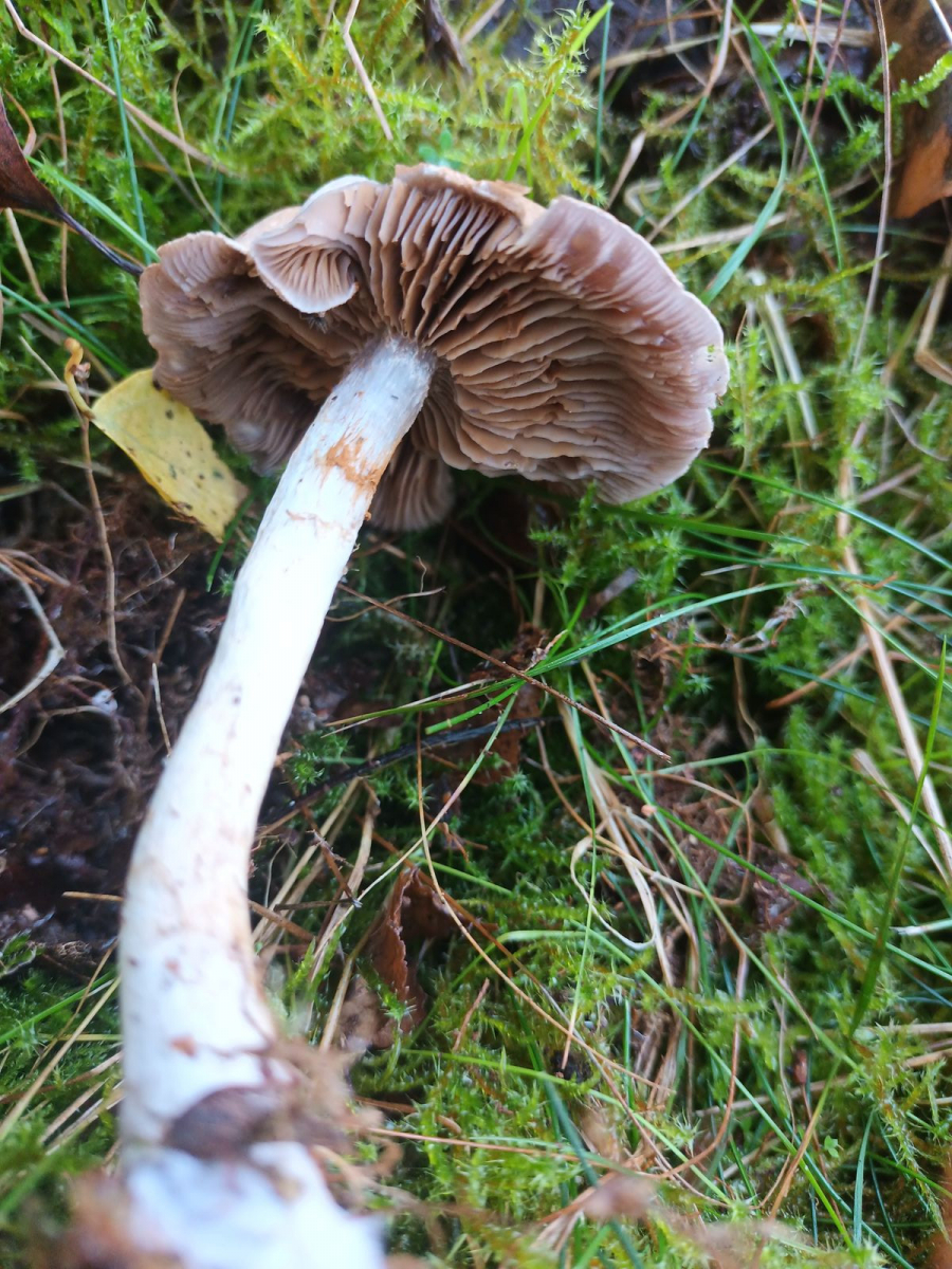 • Das ist ein Schleierling. Die Schleierreste am Stiel fangen das rostfarbene Sporenpulver auf, wordurch die markante rostrote Ringzone am Stiel entsteht. Ich würde Deinen Fund in die Untergattung der Telamonien einsortieren. Diese ist mit locker 500 Arten leider extrem artenreich, weswegen es eher unwahrscheinlich ist, dass Du mit Deinen Angaben und dem Fund eines einzelnen Fruchtkörpers am Ende auf eine belastbare Bestimmung kommst.