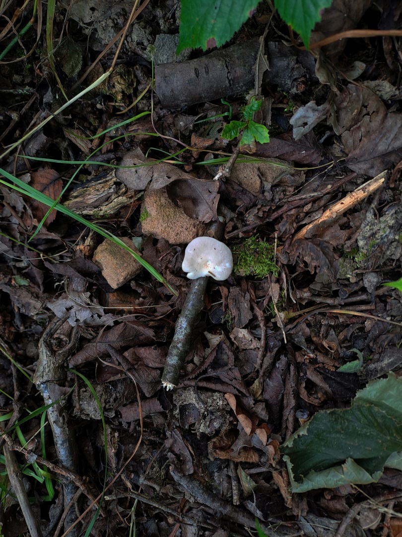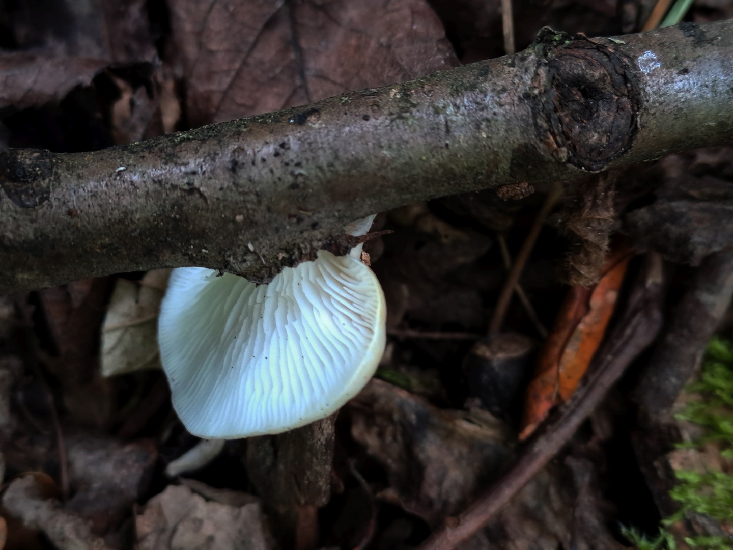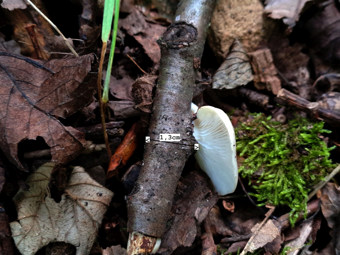 Kleiner, ca. 2x1cm großer Weißsporer (Abwurf) mit kurzem, exzentrischem Stiel und Seitlingshabitus.
