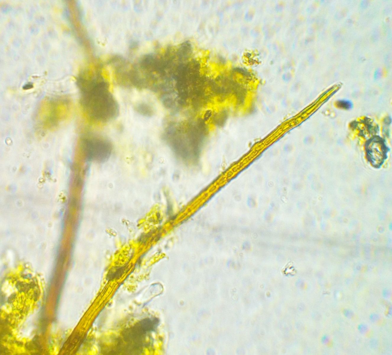 Unterm Mikroskop (alles in Wasser) sieht man vielfache Verzweigungen in Hierarchien. Die dicksten Hyphen sind 10-15 (gelegentlich fast bis 20) µm dick, eher gelbbraun, dickwandig, die dünneren sind knallgelb. Septen und Poren sehe ich eher nicht. Daneben gibt es noch transparente, dünnwandige, farblose, auch verzweigte Hyphen, die dann teils mit Septen. Sporen sind leider noch nicht zu sehen, auch nichts, was mal Spore werden will.